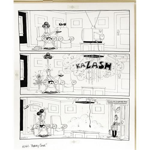 <B>Don Martin - Mad #261 Complete 1-page Story "One Wednesday Morning in Roxbury Connecticut" Original Art (EC, 1986).</B></I> Wrong remote - but don't be so distant -- you can get up close and personal with some Don Martin art with a winning bid on this furshlugginer gem. This page has an image area that measures 15" x 18.5", and the art is in Excellent condition. This lot includes the amberlith overlays that indicated where grey tones were to be dropped in by the printer. <I>From the Mad Magazine Archives.</B></I>