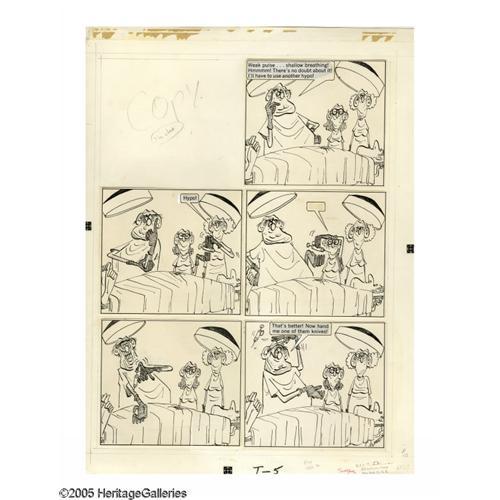<B>Don Martin - Mad #52 Complete 1-page Story "In Surgery" Original Art (EC, 1960).</B></I> See what happens when you tell your surgeon, "Physician, heal thyself"? Don Martin's way-out humor is especially effective in the operating theater. "Take one cartoon and call me in the morning." Each panel of this gag was drawn on a separate piece of paper and then glued to a large sheet of illustration board. The page has an image area of 15" x 21". Aside from the missing copy elements in the first panel, the art is in Excellent condition.