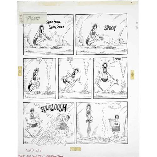 <B>Don Martin - Mad #217, Complete 1-page Story, "One Fine Day in Prehistoric Times" Original Art (EC, 1980).</B></I> During his 30-odd years as a <B>Mad</B></I> contributor, Don Martin based his humor on misery and misfortune, to crack "sick" jokes. The magazine dubbed him "Mad's Maddest Cartoonist." "Is it funny? That's the only test I know when it comes to cartooning," Martin once said. "Not whether it's sick, or whether it's going to ruin people's values or morals. You only have to ask a simple question: Is it funny?" His twisted approach influenced generations of younger cartoonists. This page has an image area of 11" x 14", and includes an amberlith overlay, which was used by the printer to put tone into the printed art. Both are in Excellent condition. <I>From the Mad Magazine Archives</B></I>.
