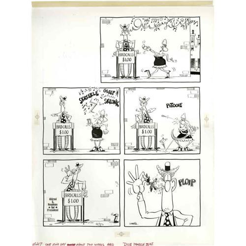 <B>Don Martin - Mad #217, Complete 1-page Story, "One Fine Day About Two Weeks Ago" Original Art (EC, 1980).</B></I> <B>The Mad World of William M. Gaines</B></I> author, Frank Jacobs, described Don Martin as, "physically he is good looking, socially he is totally uneccentric, and verbally he almost never utters 'Spap!', 'Blort!', Vreech!' or Katoonga!". But the king of onomatopoeia, Martin, certainly lets loose in this panel page from <B>Mad</B></I> #217. The art has an image area of 14.75" x 19.5", and includes an amberlith overlay, which was used by the printer to put tone into the printed art. Both are in Excellent condition. <I>From the Mad Magazine Archives</B></I>.