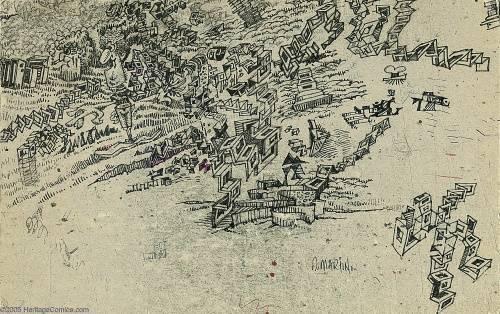 <B>Don Martin - Sketch on Cardboard (1961).</B></I> Where does <B>Mad</B></I>'s <I>maddest</B></I> artist come up with his mad ideas? This free-form drawing done on a piece of cardboard might give a clue -- it shows the inner workings of Martin's way-out imagination at play! Drawn in marker on cardboard, the sketch has an overall size of 15.25" x 9.5". Don Martin signed the drawing at the lower right. The board has numerous cut-lines scored into its surface (it may have been used as a cutting board); otherwise the art is in Good condition. Potrzebie!