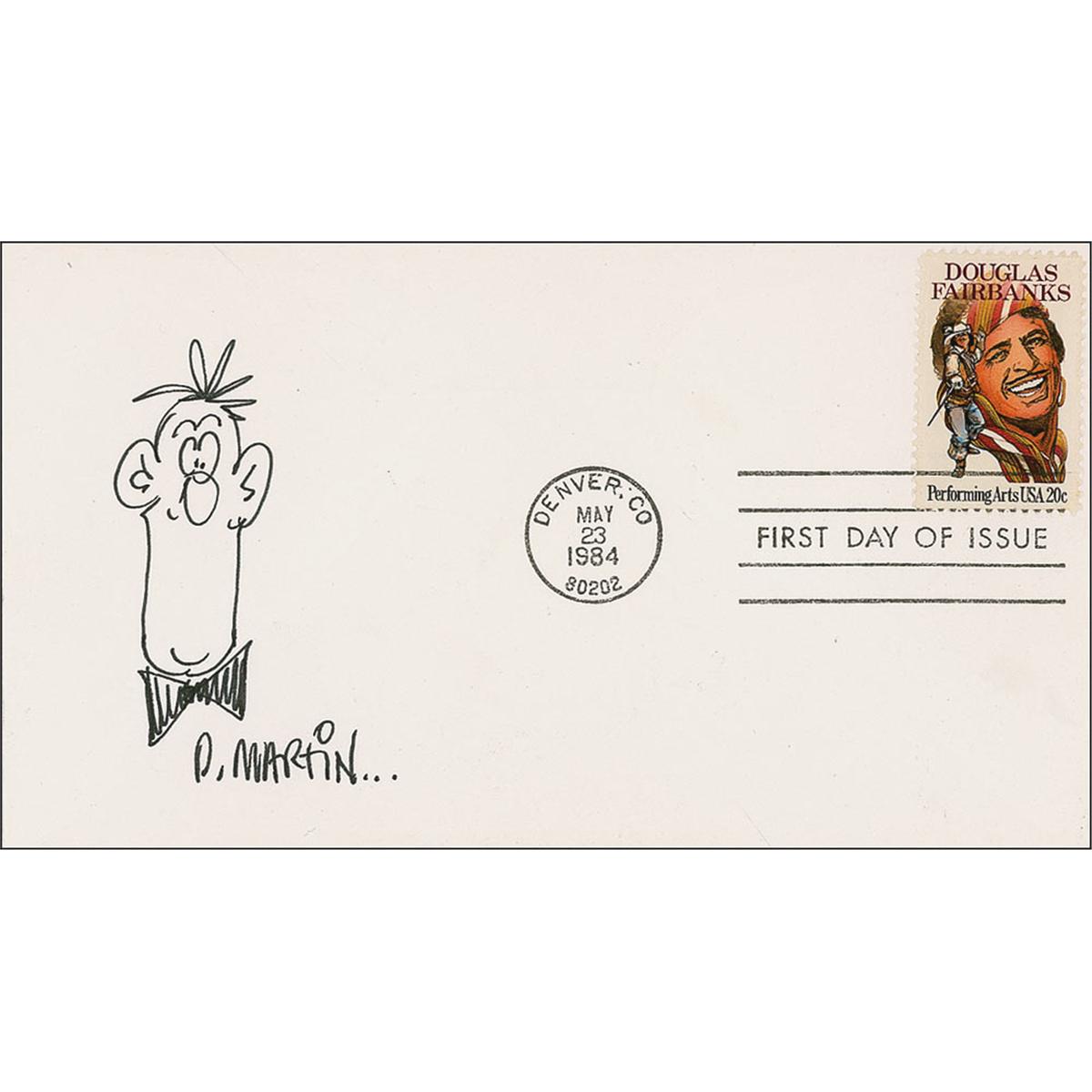 Cartoon artist (1931-2000) whose best-known work was published in Mad from 1956 to 1988. Original signed ink sketch of a bow-tied gentleman on a First Day Cover. In very fine condition.