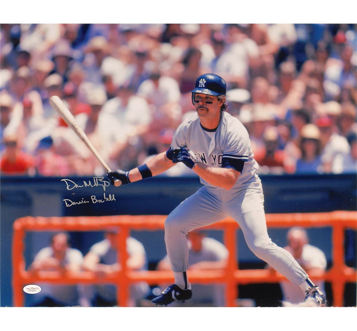 Great color satin-finish 20 x 16 photo of Mattingly after driving the ball to the opposite field, signed in silver ink, “Don Mattingly, Donnie Baseball.” In fine condition, with a JSA authentication label affixed to lower left corner.