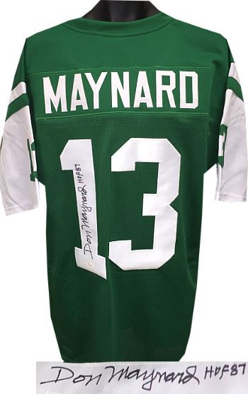 Don Maynard played primarily with the New York Jets. He was a 4 time AFL All-Star selection, won the 1967 AFL All-Star Game Offensive MVP and won one Super Bowl. He was elected into the Pro Football Hall of Fame in 1987. Don Maynard New York Jets has hand autographed this unlicensed TB custom-prostyle Green jersey with twill stitched nameplate and numbers. JSA Hologram and Certificate of Authenticity. Size XL
