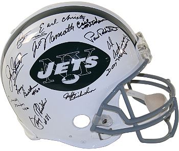 The 1968-69 New York Jets finished the Regular Season 11-3 before heading into the playoffs. In the first round they beat the Oakland Raiders 27-23 to advance to Super Bowl III before knocking off the Baltimore Colts 16-7 at the Orange Bowl January 12, 1969. This New York Jets authentic helmet is signed by Joe Namath, Emerson Boozer, Matt Snell, Don Maynard, Bake Turner, Pete Lammons, Dave Herman, John Schmidt, Bob Talamini, Randy Rasmussen, Gerry Philbin, Paul Rochester, Carl McAdams, Al Atkinson, Ralph Baker, Larry Grantham, Bill Baird, Cornell Gordon, Randy Beverly, John Dockery, Earl Christy, Paul Crane, Jeff Richardson, and Mike D'Amato. Commemorate the 69 Jets with this amazing piece, a Steiner Sports Certificate of Authenticity is included as well as a list of the names on the helmet.