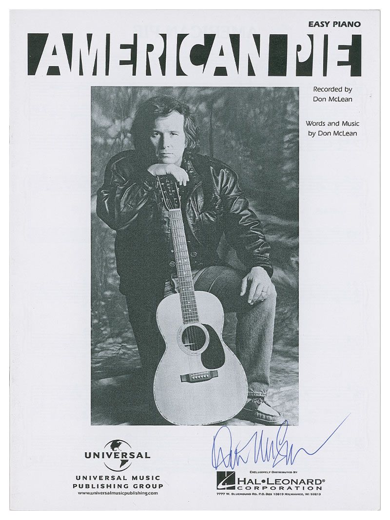 Crisp sheet music for ‘American Pie,’ 11 pages, 9 x 12, signed on the front in blue ballpoint. In fine condition.