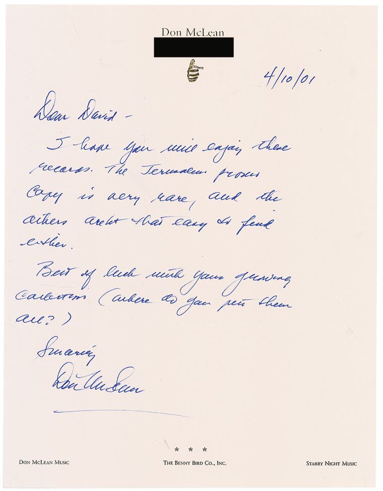 Scarce promotional copy of Jerusalem, signed on the front cover in black felt tip; and an ALS from McLean, dated 2001, which reads, “I hope you will enjoy these records. The Jerusalem promo copy is very rare, and the others aren’t that easy to find.” In fine condition, with some light rubbing and wear to album covers.
