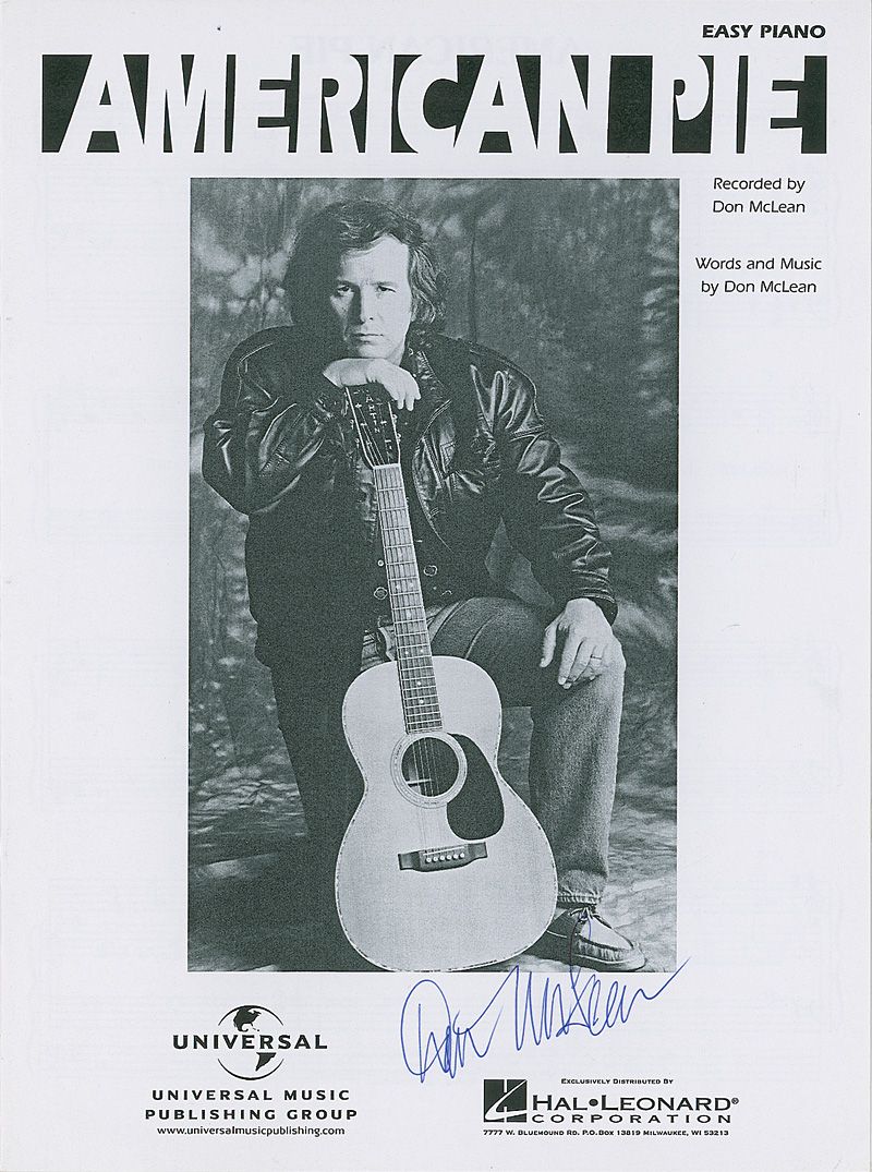 Sheet music to ‘American Pie,’ 9 x 12, 11 pages, signed on the front cover in blue ballpoint. In fine condition.