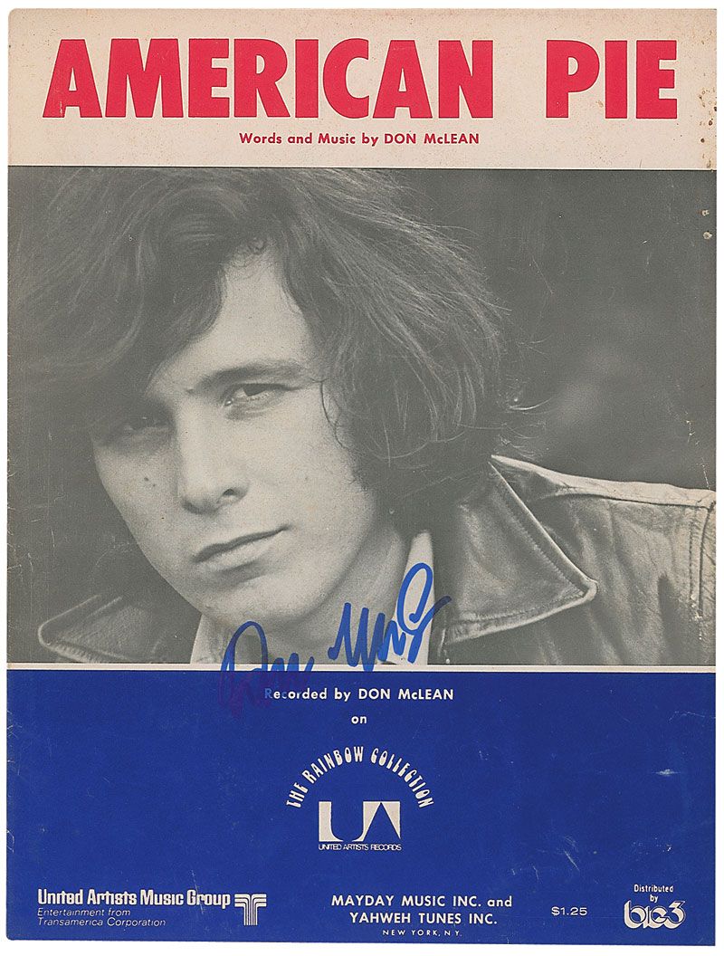 Sheet music to ‘American Pie,’ 9 x 12, 8 pages, signed on the front cover in blue felt tip. Light scattered creases, light foxing and toning to the upper border, and a small tear to the upper right, otherwise fine condition.
