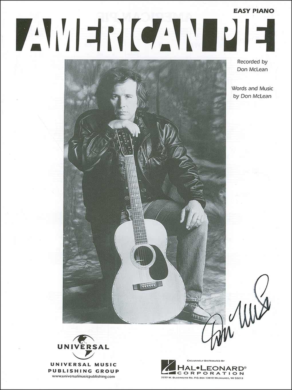 Piano sheet music for “American Pie,” 9 x 12, 11 pages, signed on the front cover in black felt tip. In very fine condition.