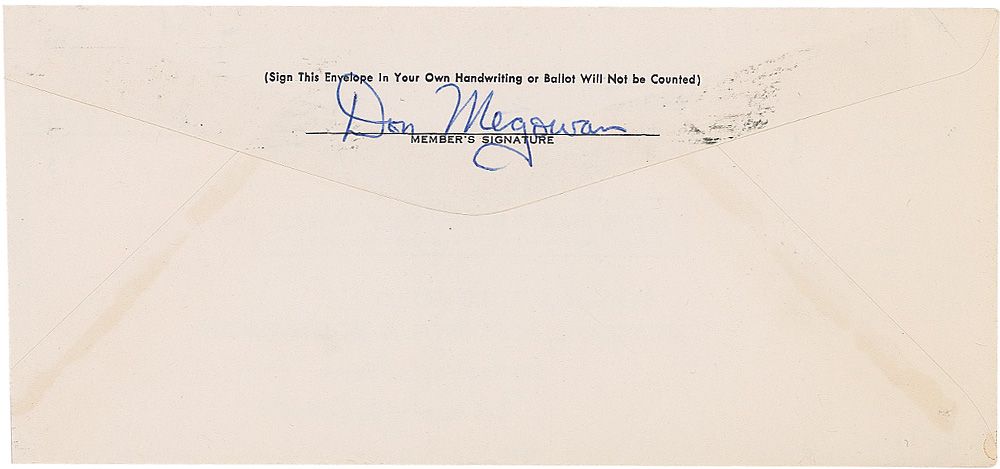 Vintage 8.5 x 3.75 Screen Actor’s Guild envelope (postmarked 2/10/1961) signed on the reverse in ballpoint, “Don Megowan.” In fine condition, with trimmed left edge and some stray postmark ink to the right of the signature. An elusive signature of the man who portrayed the monster during the filming of the land scenes in The Creature Walks Among Us (1956). Megowan also starred in The Werewolf (1956) and The Creation of the Humanoids (1962).