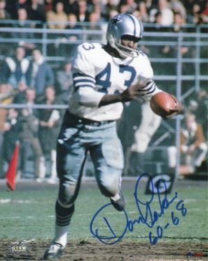 Don Perkins signed a personal-services contract with the Dallas Cowboys for a $1,500 bonus and a $10,000 salary. This meant he would play for the Cowboys if and when they received an NFL franchise. But he was drafted in the 1960 NFL Draft by the Baltimore Colts, before he was granted to an NFL franchise. Because of this issue, the Colts were compensated with a Cowboy's 9th round draft pick, in the 1961 NFL Draft. Perkins began playing with the Cowboys in 1961, rushing for 4.1 yards per carry, and was named NFL rookie of the year. He was a runner who lacked long-distance speed, but made up for it with outstanding quickness and deft agility. He also had great balance and could really cut. He became the first running back in Cowboys' history to run for 100 yards in a game. Don Perkins has hand autographed this Dallas Cowboys 8x10 Photo with 60-68 inscription. GTSM Hologram and Certificate of Authenticity from Athlon Sports.
