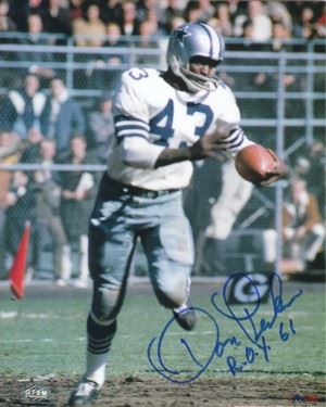 Don Perkins signed a personal-services contract with the Dallas Cowboys for a $1,500 bonus and a $10,000 salary. This meant he would play for the Cowboys if and when they received an NFL franchise. But he was drafted in the 1960 NFL Draft by the Baltimore Colts, before he was granted to an NFL franchise. Because of this issue, the Colts were compensated with a Cowboy's 9th round draft pick, in the 1961 NFL Draft.Perkins began playing with the Cowboys in 1961, rushing for 4.1 yards per carry, and was named NFL rookie of the year. He was a runner who lacked long-distance speed, but made up for it with outstanding quickness and deft agility. He also had great balance and could really cut. He became the first running back in Cowboys' history to run for 100 yards in a game. Don Perkins has hand autographed this Dallas Cowboys 8x10 Photo with ROY 61 inscription. GTSM Hologram and Certificate of Authenticity from Athlon Sports.