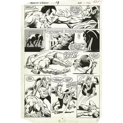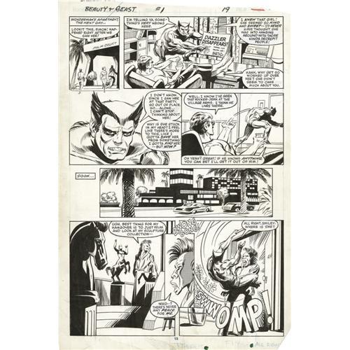 <B>Don Perlin - Beauty and the Beast #1, pages 15 and 16 Original Art (Marvel, 1984).</B></I> Don't look for any dancing candlesticks or singing teapots on these pulse-pounding pages. Featured here is none other than Happy Hank McCoy, better known as the former X-Man, former Avenger, and former Defender, the bouncing, blue-furred Beast! Penciled by Don Perlin, these pages show Hank in a knock-down drag-out with Rocker, a fight Hank seems to be losing. Each page has a 10" x 15" image area, and are in Excellent condition. <BR><BR><B>Important notice:</B> Heritage usually auctions material at the rate of 200-250 lots per hour. On some occasions eBay Live bid software or the Internet may not be able to keep up with the pace of the auction. We recommend placing a realistic absentee bid now as insurance to avoid disappointment. Occasionally the auctioneer may eliminate or reject an eBay Live bid, and the auctioneer may also reopen a lot after the close of the eBay live bidding (usually because we missed an audience bid), and may reject your bid even if it shows you as the winning bidder. By bidding via eBay Live, you agree that Heritage may award the lot to another bidder at its sole discretion under the circumstances described above or any other reasonable circumstances. Since eBay bids are not shown to us until we open the lot on the floor, we treat those bids just like floor bids. In most cases the floor responds before the eBay bid is presented to us, due to Internet lag time, so for consistency we have made it a policy that floor bids are always considered first over tie eBay live bids. Also please note that all Heritage lots purchased through eBay Live carry a 22.5% Buyer's Premium. Please make sure you read the Terms and Conditions before you bid. This lot is being auctioned in conjunction with a live floor auction by Heritage Auction Galleries. All final auction and invoice information will be supplied by Heritage Auction Galleries, and all other information should be considered preliminary. Lot:41001 <BR><BR><B>Winning Notification and Billing:</B> After the FINAL session in this auction is complete, Heritage will send e-mail and snail mail invoices. This process normally takes several days. All final auction and invoice information will be supplied by Heritage Auction Galleries, and all other information should be considered preliminary. <BR><BR>This auction will be conducted on a live auction floor and over the Internet through eBay Live. If you choose to place an absentee bid, please take a moment to <font color='#0000ff'><u><a href='http://pages.ebay.com/liveauctions/help/before/laabsentee.html'>learn how eBay Live absentee bidding works</a></u></font><font color='#000000'>