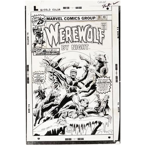 <B>Don Perlin - Werewolf By Night #38 Cover Original Art (Marvel, 1976). </B></I> In "a new beginning for the macabre moon-beast," Jack Russell is cornered on a cliff and clawing for his life in the hard-hitting cover scene created for the yarn, "Rebirth Also Kills." Don Perlin's ferociously feral scene will make a spectacular showpiece for fans of this Bronze Age classic. This cover has an approximate image area of 9.75" x 14.5", and the art is in Excellent condition.<BR><BR><b>Shipping:</b> Flat Material, Small (<a target="_blank" href="http://www.heritageauctions.com/common/shipping.php">view shipping information</a>)