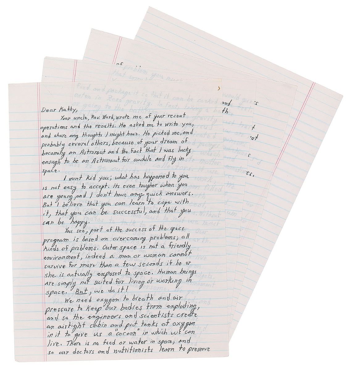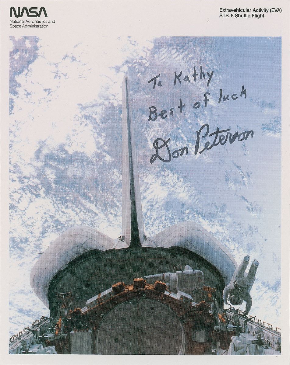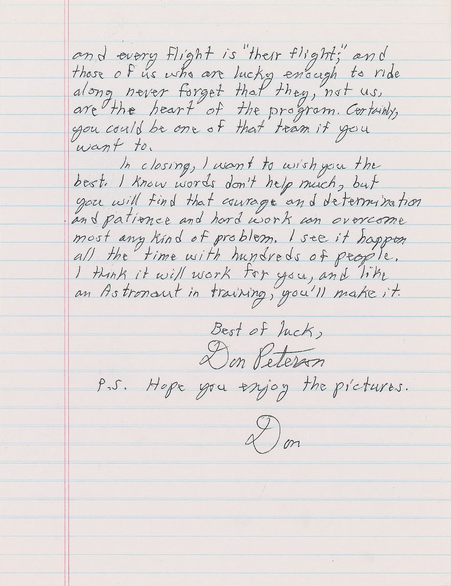 Three items: a fantastic ALS, four pages, lightly lined, no date, in part: “Part of the success of the space program is based on overcoming problems; all kinds of problems. Outer space is not a friendly environment, indeed a man or woman cannot survive for more than a few seconds if he or she is actually exposed to space. Human beings are simply not suited for living or working in space. But, we do it!…Now, I’ve never had to facet the kind of problem you must face, but I would guess that sometimes you must feel like we feel. You have to depend on ‘gadgets’ like medicine and braces, and you must trust a lot of other people that you know are not in your situation. They, like our engineers and doctors are trying to help, but sometimes you doubt that ‘they really understand your problem.’ We feel that way too sometimes.” Peterson signs his name again after a brief postscript, “Hope you enjoy the pictures, Don.” Included are the referenced pictures: two official color 8 x 10 NASA lithographs, one showing two astronauts working on the STS–6 Challenger, and the other of Peterson posing in his flight suit, both signed and inscribed in black felt tip to “Kathy.” In overall fine condition.