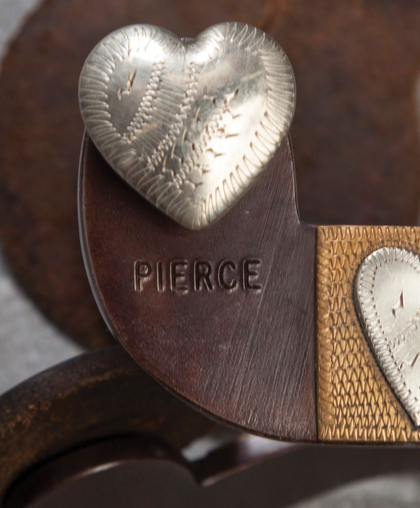 Don Pierce Heart Spurs. Contemporary silver and brass-mounted, "PIERCE" maker-marked heart pattern spurs with upturned heart-shaped, engraved buttons, 20-point rowels and floral carved two-piece leathers. Unused condition.