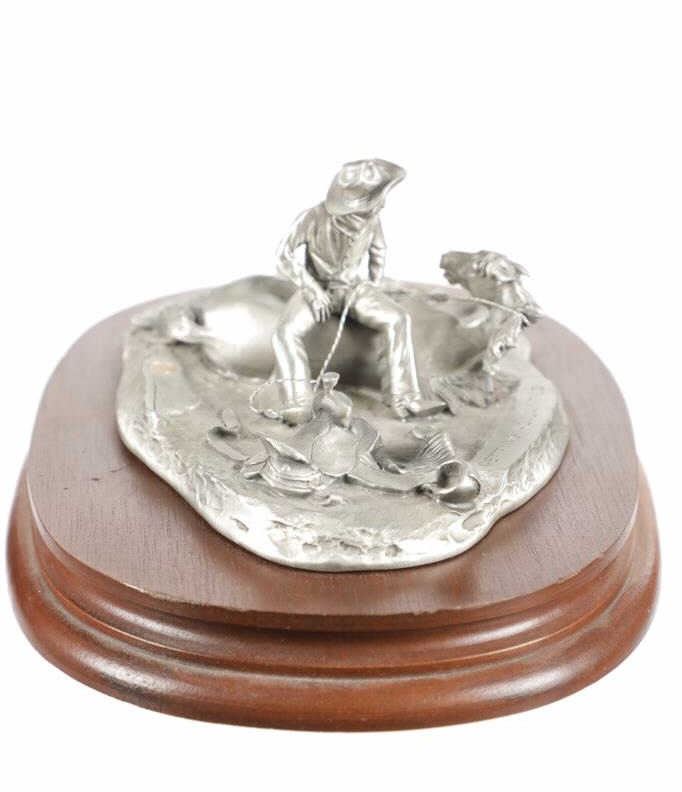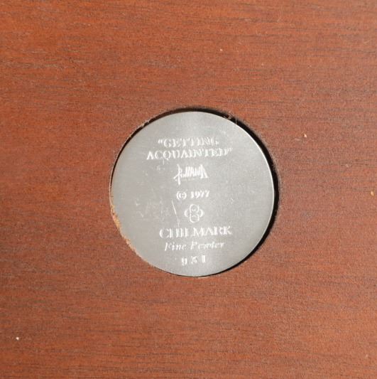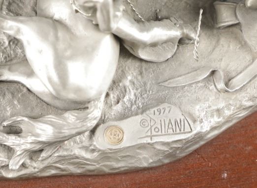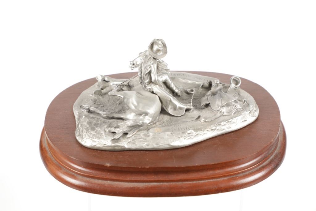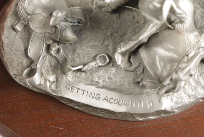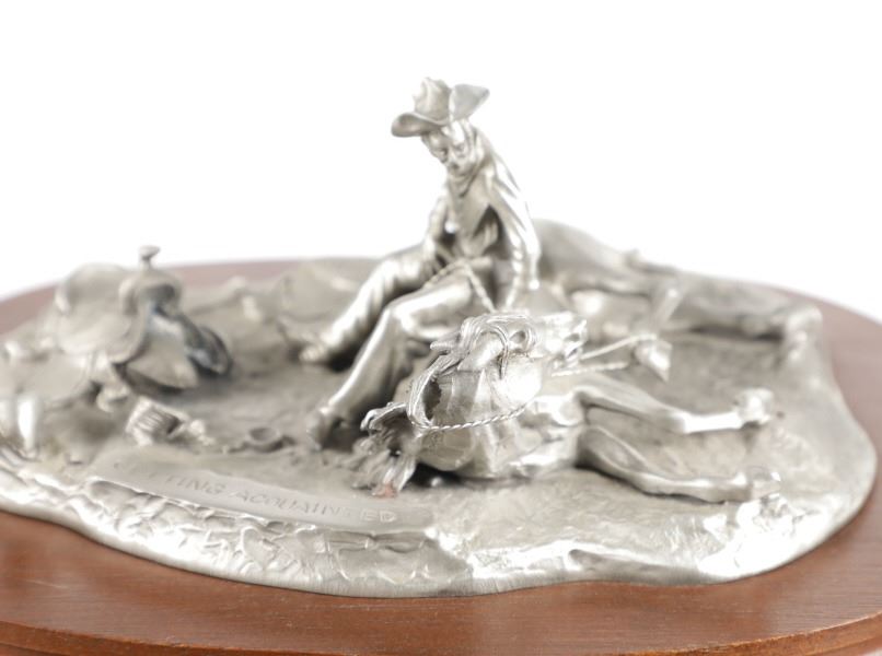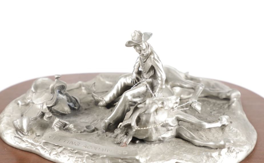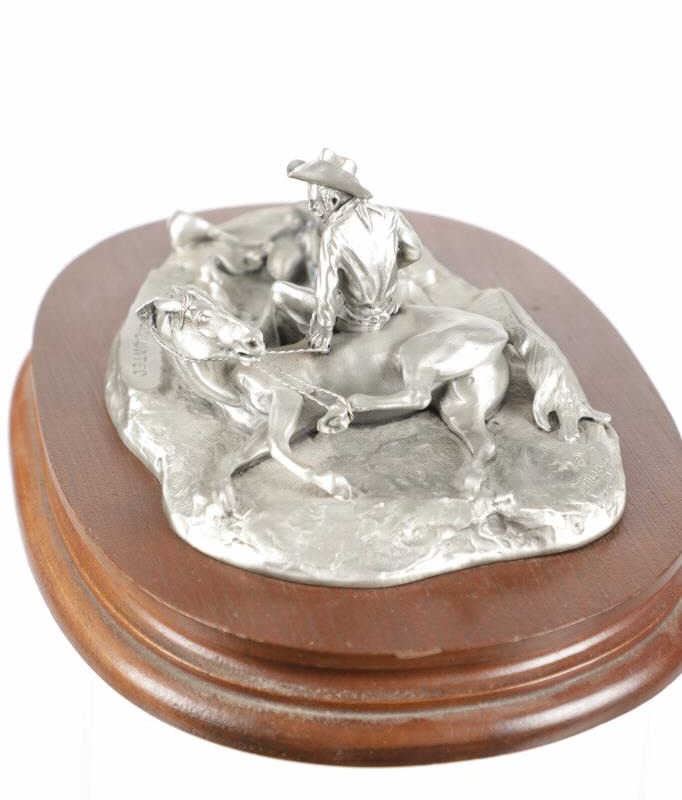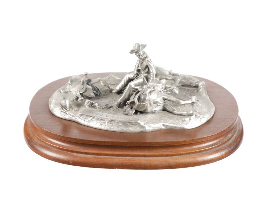 Featured in this lot is a beautiful limited edition pewter sculpture, made by Chilmark and designed by artist, Don Polland. This piece features a cowboy that has roped a wild horse to the ground which he is sitting on. His saddle is next to them. This sculpture is very detailed and Chilmark is known for its fine pewter. On the back is the signature of the artist Polland, 1977 and numbered 931. Overall the sculpture is in fair condition. It is not attached to the wood base. The sculpture measures 8" L x 6 1/4" W x 4" H.*