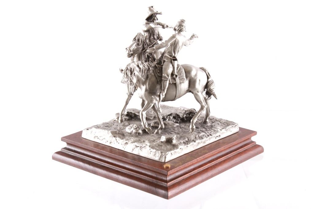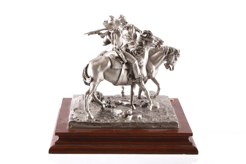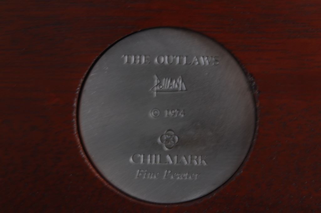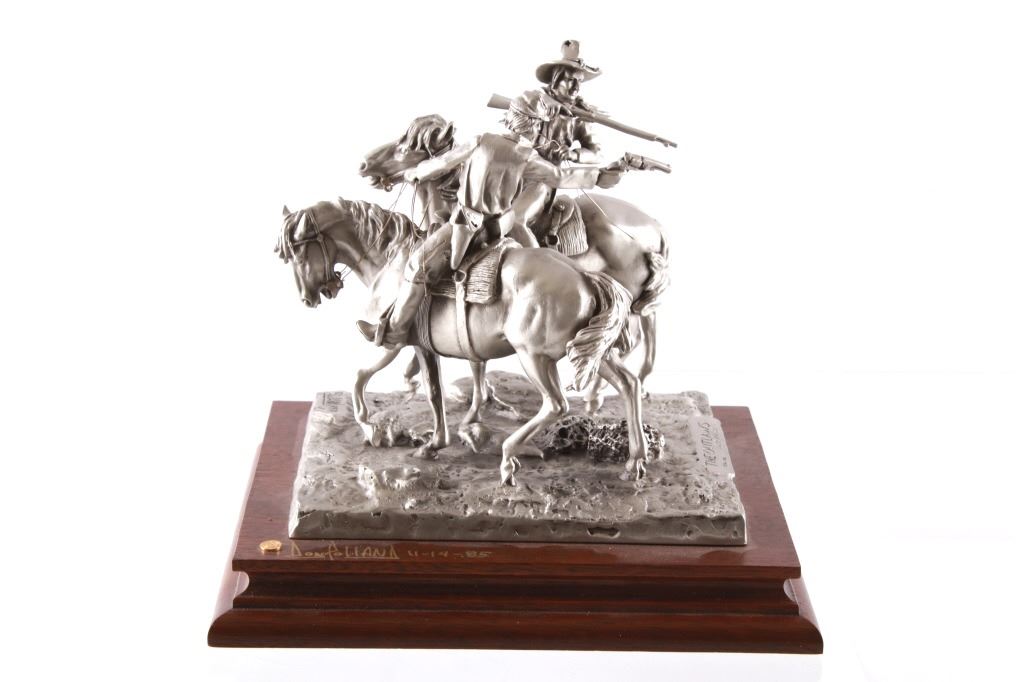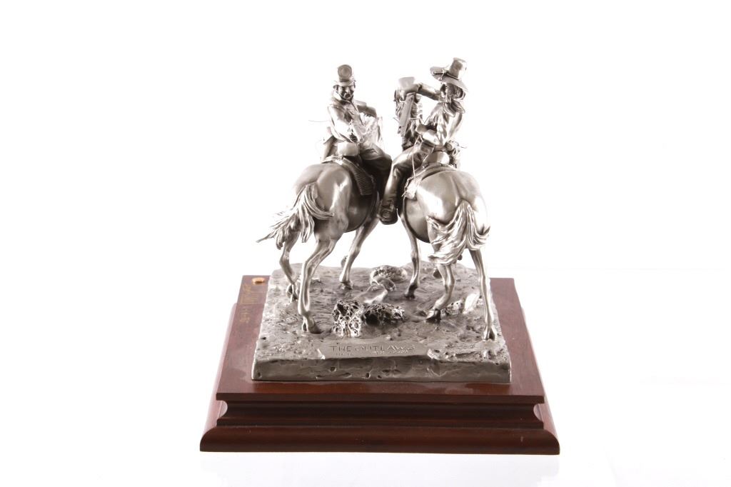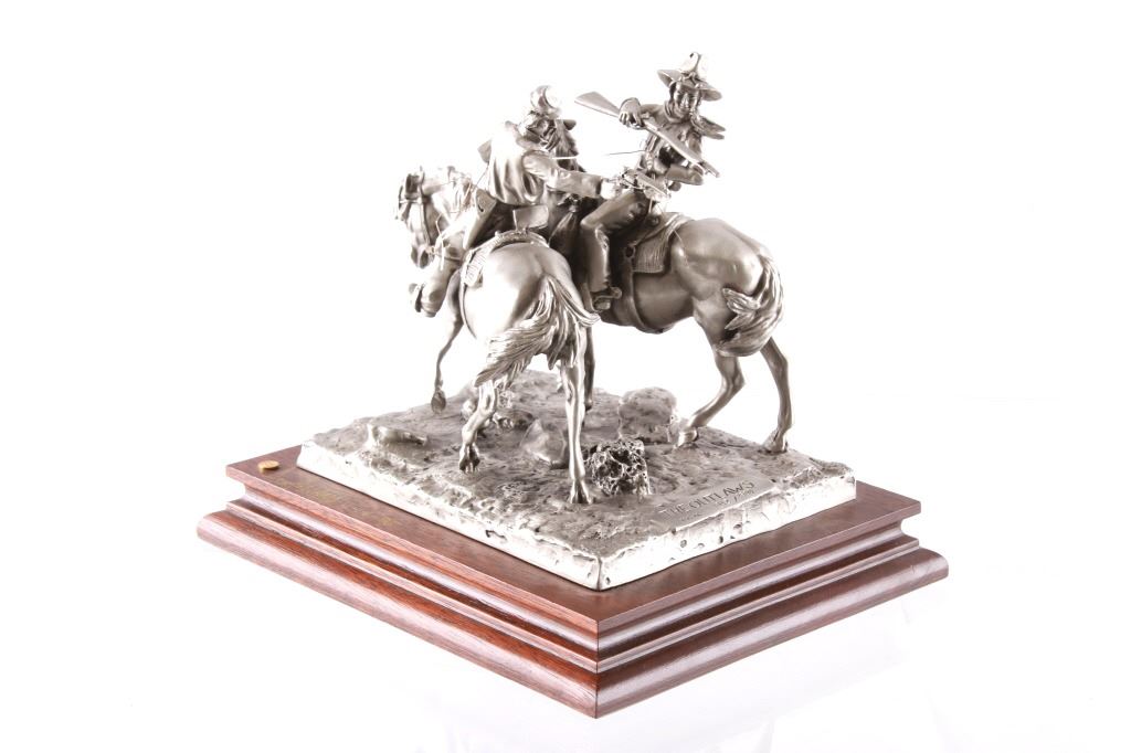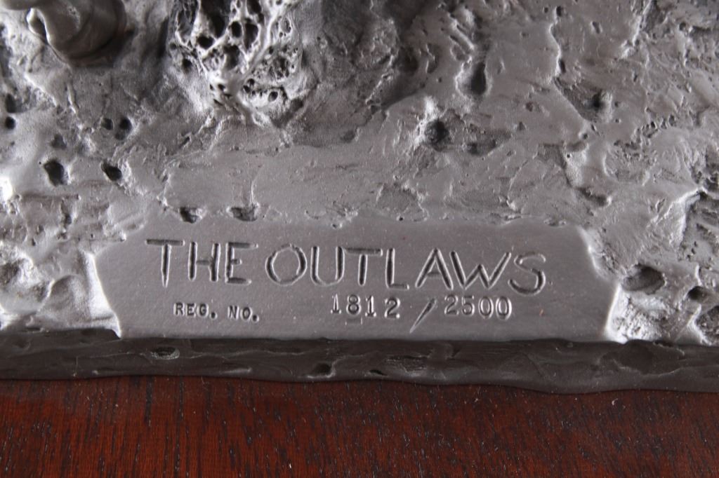 Featured in this lot is this pewter sculpture called "The Outlaws," by Don Pollard and circa 1985. The pewter sculpture features a wonderfully and professionally crafted pewter construction mounted on a hardwood shield and shows a pair of outlaws drawing there guns behind them and riding there horses forward. The wooden shield is hand signed by the artist with the date next to the signature. The pewter sculpture reads as follows: The Outlaws - Reg. No. 1812/2500. The condition of this pewter sculpture is good with no obvious signs of damage and shows good overall condition. The measurements of this sculpture are 6 1/2" x 7" x 6 1/8".