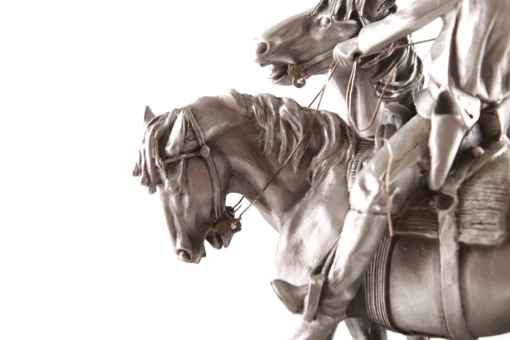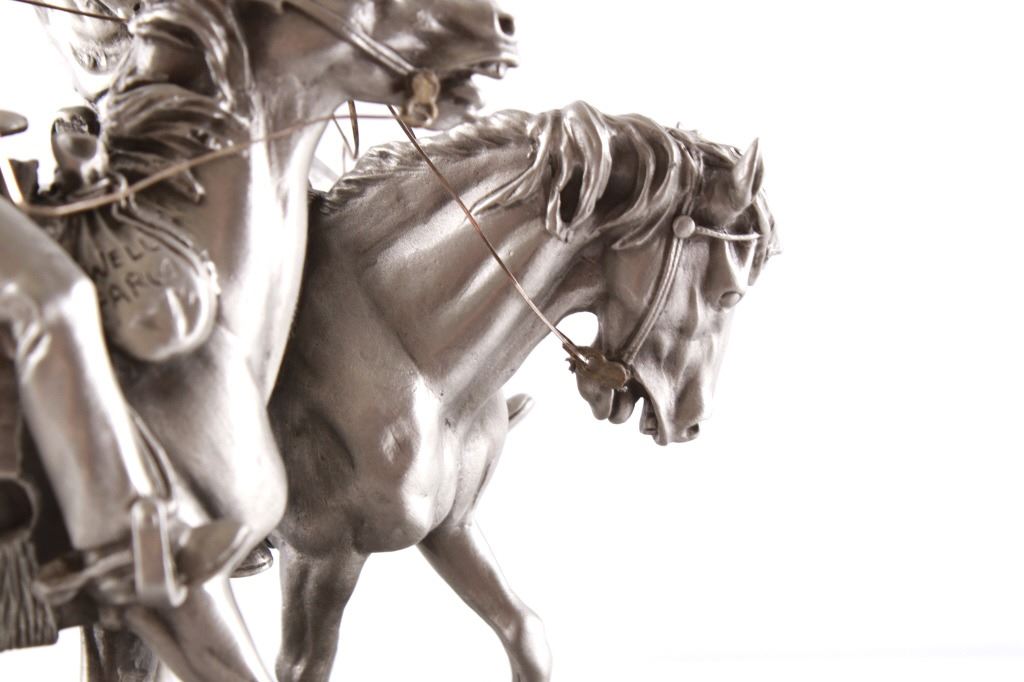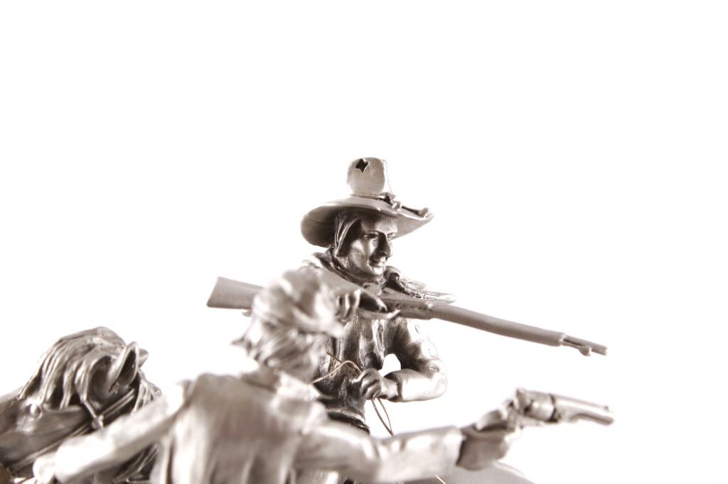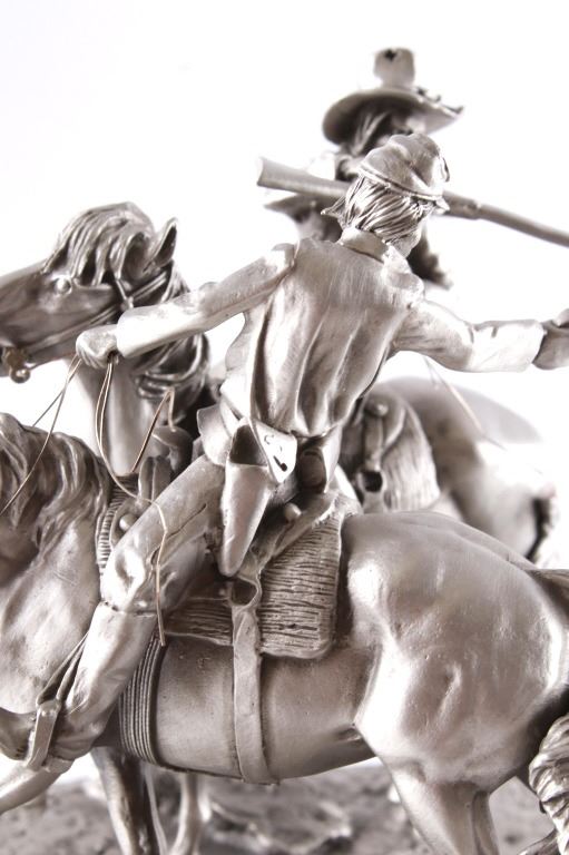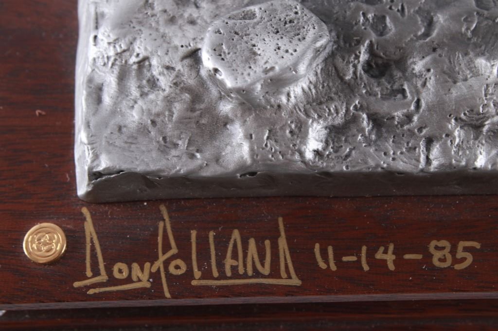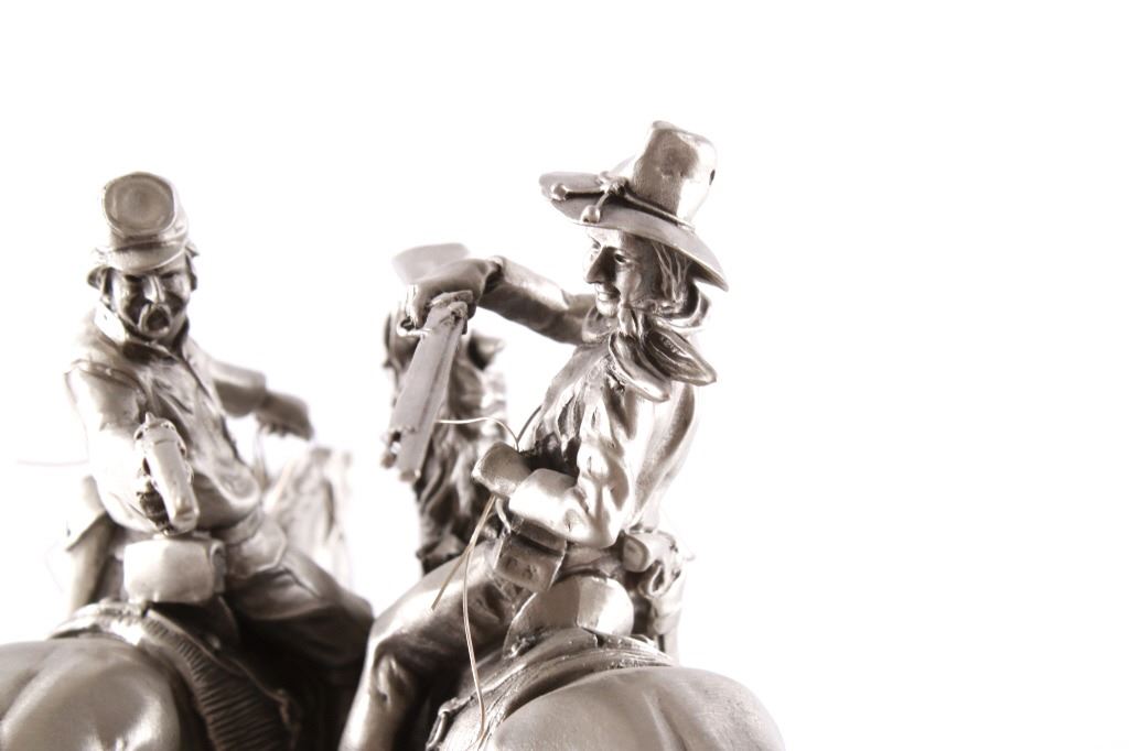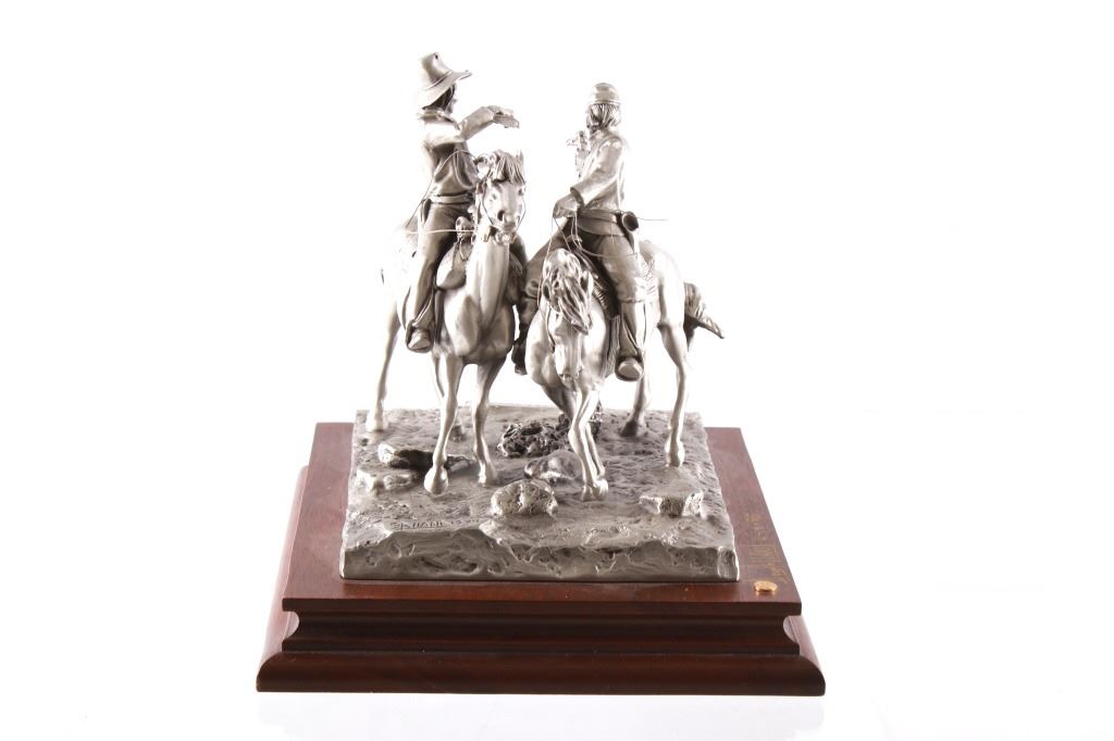 Featured in this lot is this pewter sculpture called "The Outlaws," by Don Pollard and circa 1985. The pewter sculpture features a wonderfully and professionally crafted pewter construction mounted on a hardwood shield and shows a pair of outlaws drawing there guns behind them and riding there horses forward. The wooden shield is hand signed by the artist with the date next to the signature. The pewter sculpture reads as follows: The Outlaws - Reg. No. 1812/2500. The condition of this pewter sculpture is good with no obvious signs of damage and shows good overall condition. The measurements of this sculpture are 6 1/2" x 7" x 6 1/8".