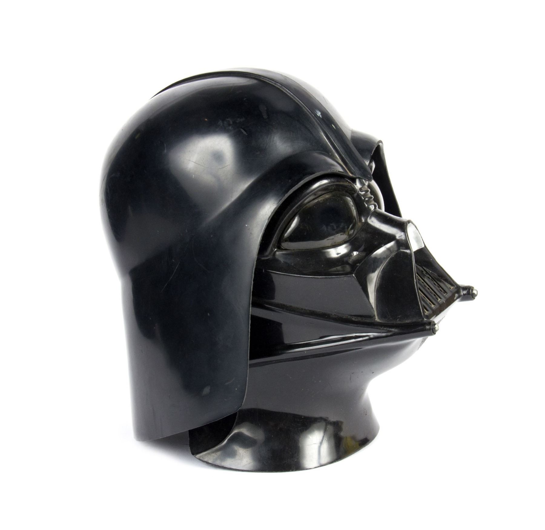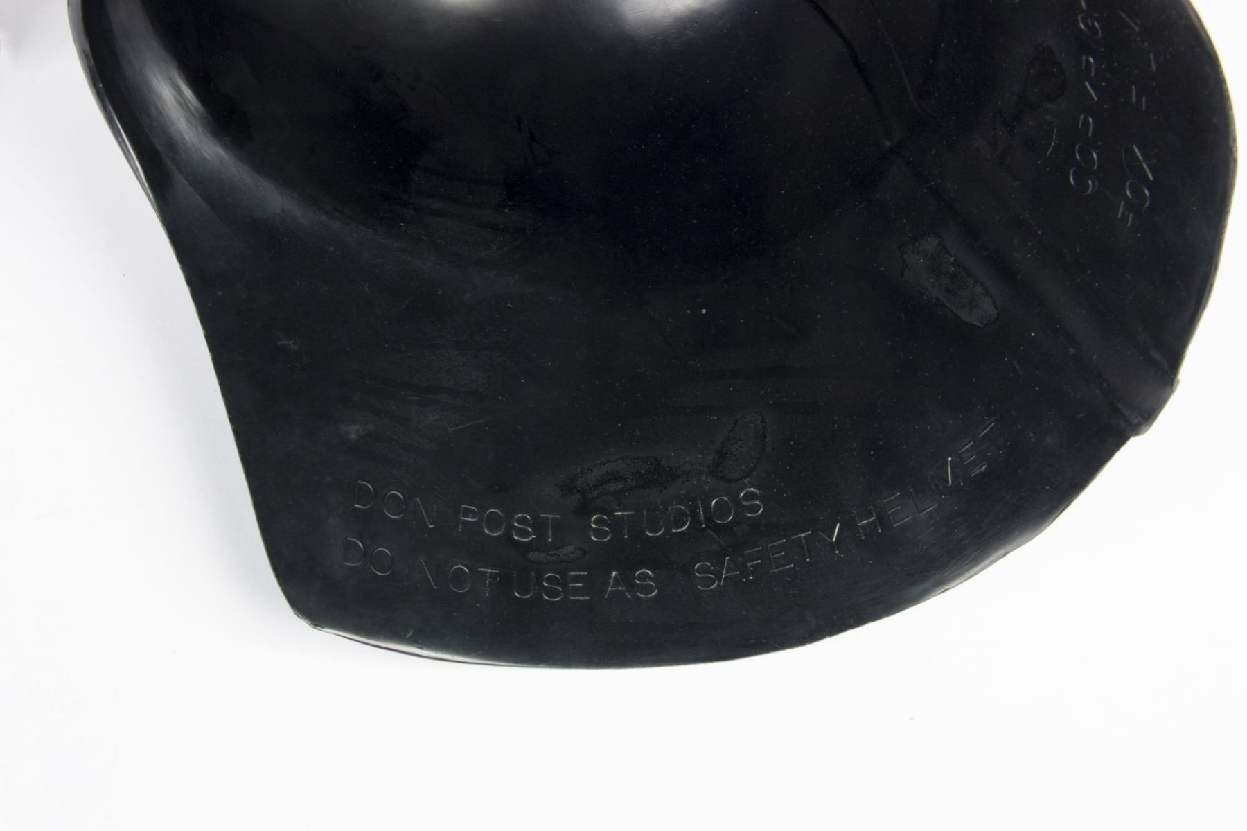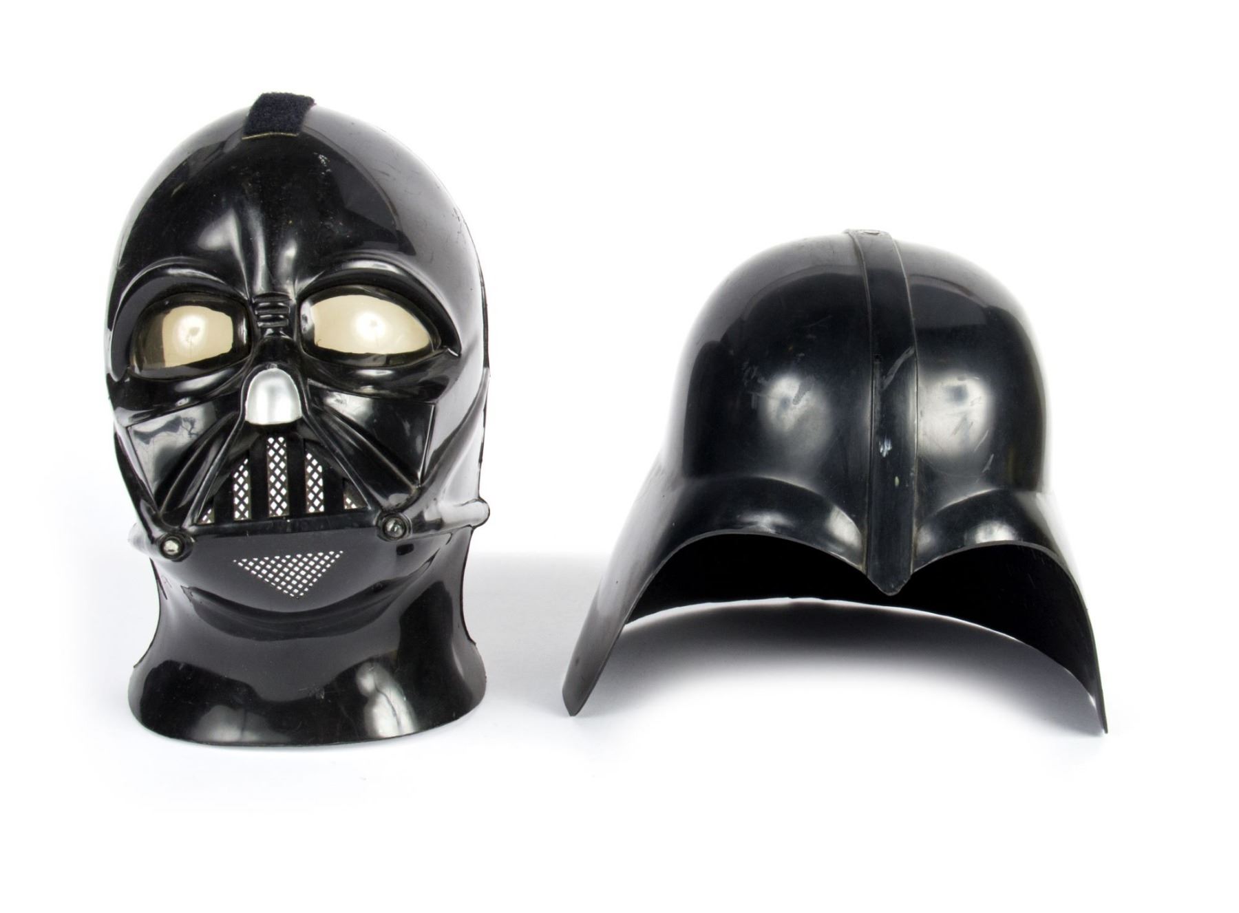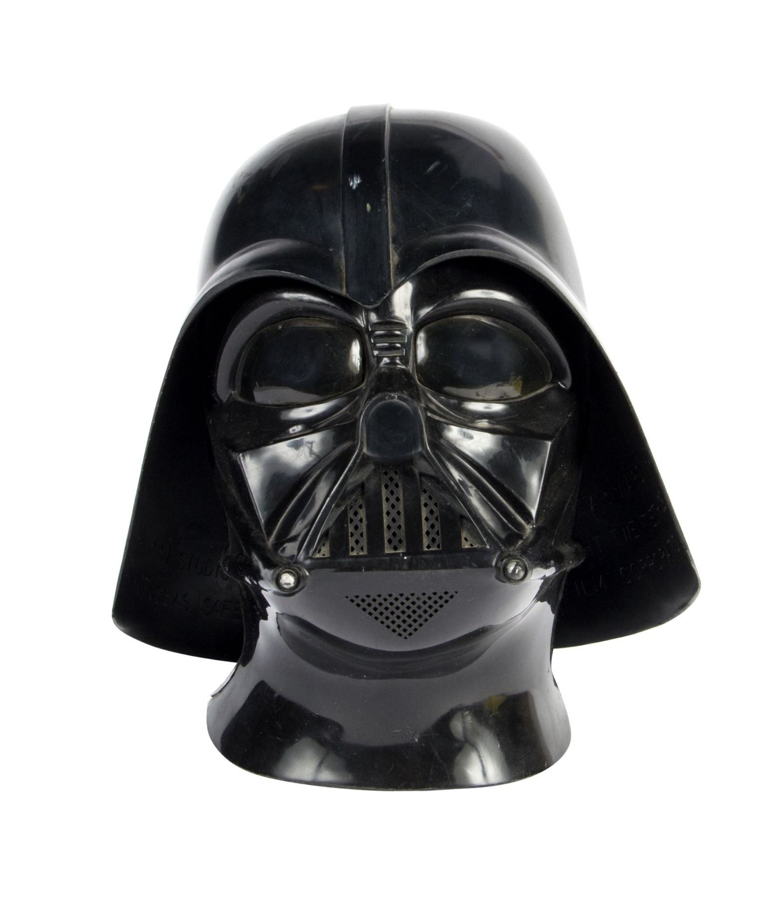 (Don Post, c.1979) An original Darth Vader mask created by Don Post Studios. The earliest versions of these popular masks have rounded protruding points in the mouth area, such as this original mask does. Later masks had silver stickers placed on the points instead of rounded areas, and it is believed that this was due to the difficulty in keeping the protruding points intact while removing the masks from their molds. This rare mask was created in a hard plastic, with the top portion of the helmet attached by velcro. The helmet has excellent detail and is a beautiful representation of this iconic villain. Measuring approximately 12" tall, the mask is in fair condition with scratches and surface wear throughout from use. There are no cracks or broken pieces in the plastic, and the helmet still presents itself very nicely.