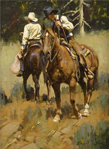 Don Prechtel (b. 1937). Riding Out. 16" x 12" oil on board. Signed lower right. (est $1,000-1,500)