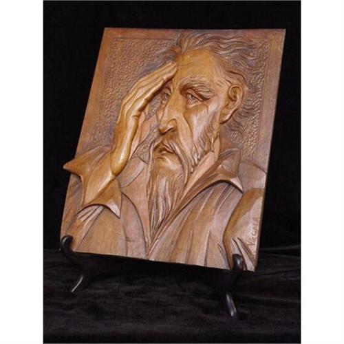Carved wood plaque depicting Don Quixote de la Mancha, Cervantes' famous character. Signed by artist E. Virgala. One of a pair listed separately. Can be displayed on a stand as shown, hung on the wall or incorporated into a piece of furniture. Wood stand for display only (not included). In very good used condition as shown. Please ask questions, request additional photos and shipping costs before buying.