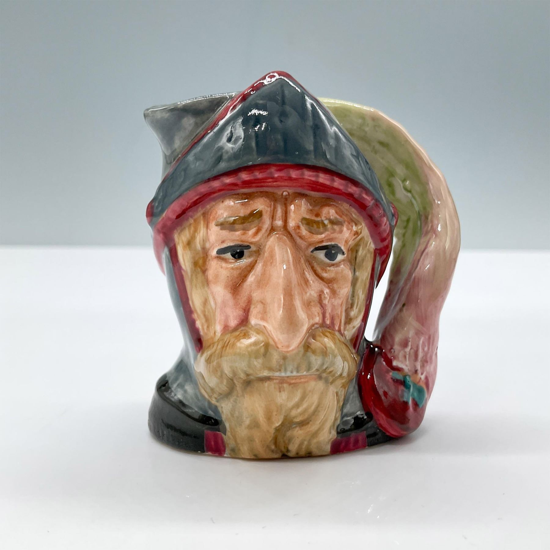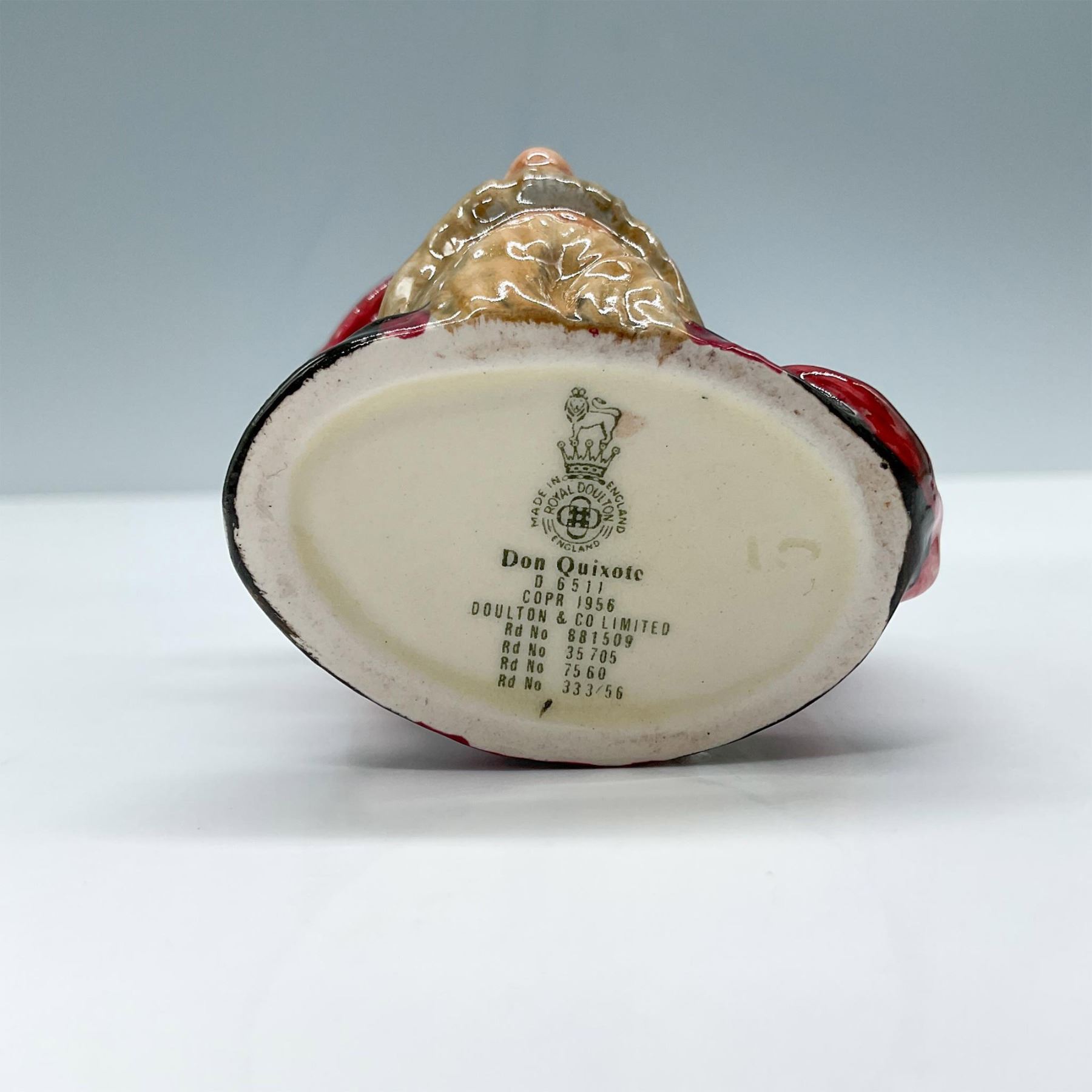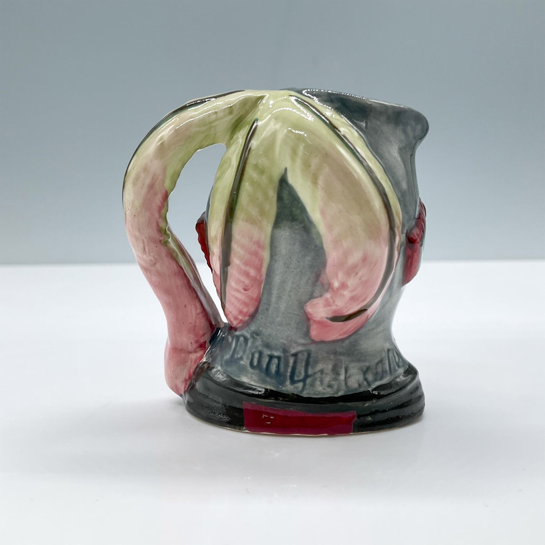 Figural jug of the hidalgo, with blond facial hair, from the Spanish epic novel by Miguel de Cervantes. Black, gray, red armor and helmet. Pale green to pink feather and a red shield as the handle. Royal Doulton backstamp.