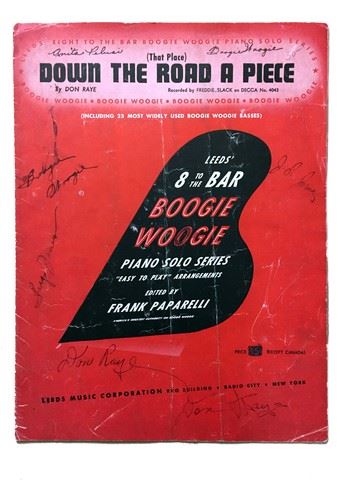 Autographed cover for sheet music: "Down The Road A Piece" by Don Raye, from Leeds' 8 to the Bar Boogie Woogie Piano Solo Series.