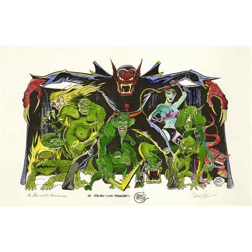 <B>Don Rico - Daredevil and the Claw Hand Colored Print, Group of 2 (1976).</B></I> Lev Gleason's Daredevil battles the macabre minions of the Claw in a dynamic hand-colored print by Golden Age artist Don Rico, titled "Daredevil Besieged." The Claw gathers his troops for an onslaught in the second hand colored print featured in this lot, titled "The Claw and His Henchmen." Each print has an overall size of 22.5" x 14". Aside from some paper aging around the borders of the Daredevil print (due to being light struck), the prints are in Good condition. Each was titled and signed twice by Don Rico.