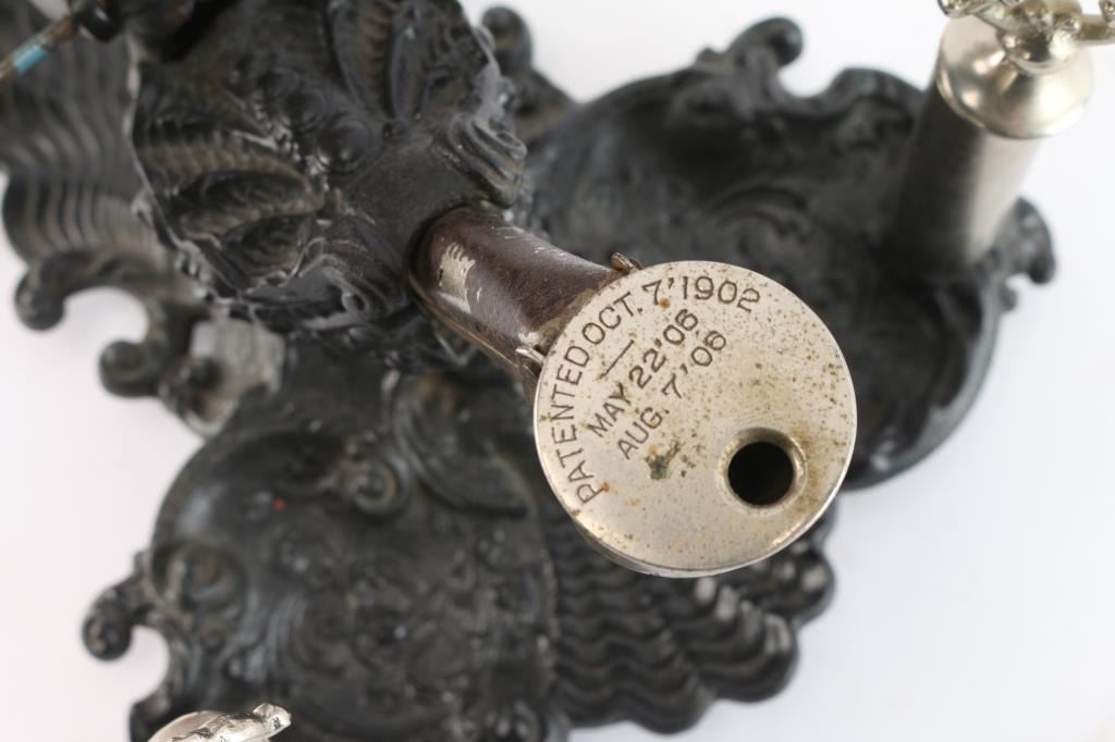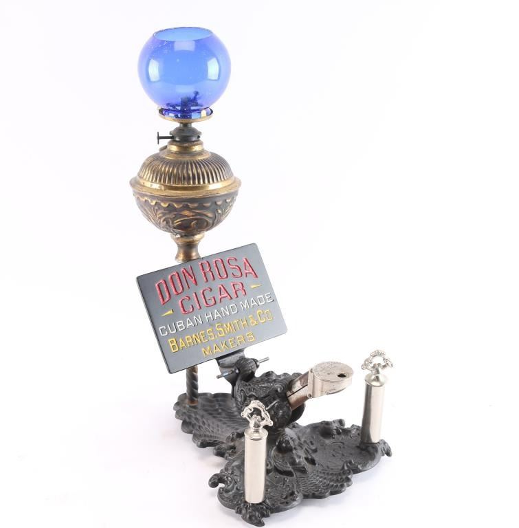 Patented 1902, 1906. Featuring lamp at top with 2 wick style at front. Approximately 13" tall by 9 1/2" wide from back to front. Very good condition. Includes blue glass globe.