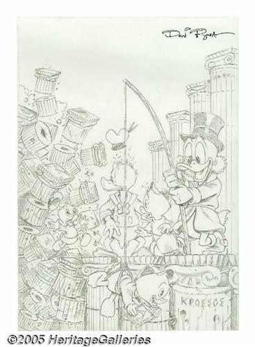 <B>Don Rosa - Walt Disney's Comics and Stories #602 Cover Preliminary Original Art (Gladstone, 1996).</B></I> The finished version of this cover may have been lightbox-inked from this pencil preliminary, as this piece is far more detailed and tightly-penciled than a traditional "prelim." A gorgeous piece by one of the best of the modern duck artists. The image area measures 8.5" x 11" and the art is in Excellent condition. A copy of the comic book is also included.