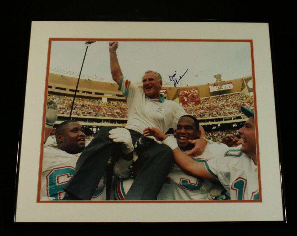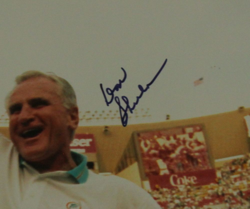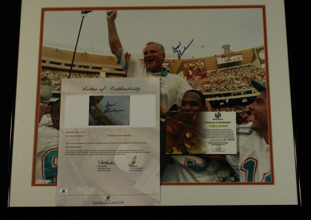 Hand-signed in blUE felt-tip pen by Don Shula. Custom framed to 24x20 in size. Autograph includes a Global Authentics (GA) hologram and matching LOA for authenticity purposes.