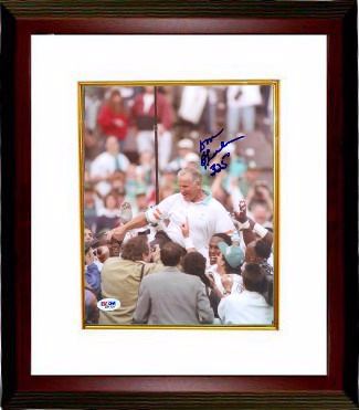 Don Shula is best known as coach of the Miami Dolphins, the team he led to two Super Bowl victories, and to the National Football League's only perfect season. Shula was named 1993 Sportsman of the Year by Sports Illustrated. He currently holds the NFL record for most career wins with 347. Shula only had two losing seasons (below .500) in his 32-year career. Don Shula has hand signed this Miami Dolphins 8x10 Photo with 325 (wins) inscription. PSA DNA Hologram and Certificate of Authenticity. Custom White Mat and Mahogany Black Color Framed as shown.