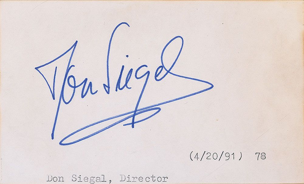 Versatile and durable director (1912–1991) who helmed such classics as Invasion of the Body Snatchers, Dirty Harry, and John Wayne’s final film, The Shootist. Siegel was singled out by Clint Eastwood as one of his most important directorial influences. Felt tip signature, “Don Siegel,” on an off-white 5 x 3 card with typed collector’s notations along bottom. In fine condition, with some mild edge toning.
