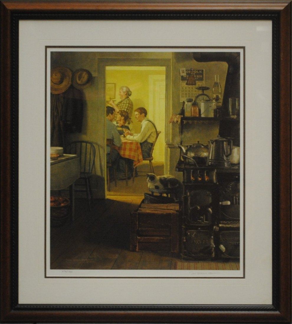 Don Spaulding's "Harvest Supper" limited edition print signed and numbered 272/750. This has been professionally double matted with acid free matting, and has been custom framed under glass. Image- 20" x 24". Frame- 35 1/2" x 31"