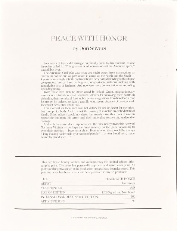 Signed limited edition print 559/1200, "Peace WIth Honor". frame measures 29.5" x 35.5"