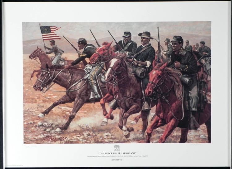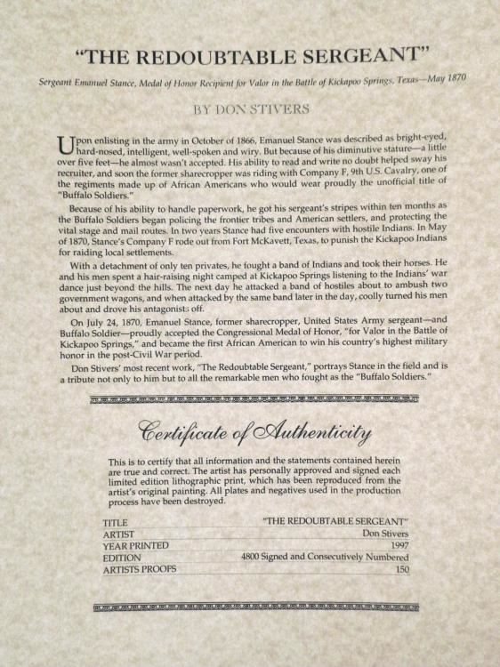With a detachment of only ten privates, he fought a band of Indians and took their horses. He and his men spent a hair-raising night camped at Kickapoo Springs listening to the Indians' war dance just beyond the hills. The next day he attacked a band of hostiles about to ambush two government wagons, and when attacked by the same band later in the day, coolly turned his men about and drove the antagonist off. This valiant effort earned Emmanuel Stance the Congressional Medal of Honor and became the first African American to win his country's highest military honor in a post-Civil War period. Artist: Don StiversTitle: The Redoubtable Sergeant Medium: Print on paperEdition: Out of 3600Date: 1997Signature: Signed and numbered by the artist in pencilImage Size: 15 1/2" x 24" Paper Size: 21" x 29"Condition: ExcellentAuthenticity: Included Biography Following a natural inclination towards American History as a subject for fine art, Don, in the 1970's, began a series of paintings on the Westward Expansion. In 1984 he began painting Civil War subjects. With the help of professional historians and driven by his own desire to know the most intricate visual details of the subjects he portrays, he has created some of the most remarkable military art of this century. His focus on the Buffalo Soldier, beginning with Tracking Victorio in 1988 shone light on a subject that had rarely been chronicled in military art before. The Buffalo Soldier prints ignited such an overwhelmingly positive response that very often his limited editions were sold out within hours of their release. *Retrieved from: http://www.donstivers.com/about