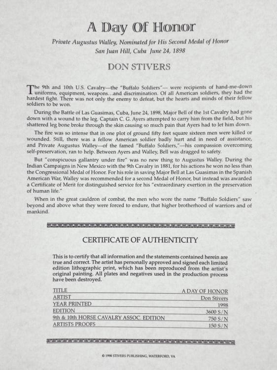 During the Battle of Las Guasimas, Cuba, June 24, 1898, Major Bell of the 1st Cavalry had gone down with a wound to the leg. Captain C. G. Ayers attempted to carry him from the field, but his shattered leg bone broke through the skin causing so much pain that Ayers had to let him down. The fire was so intense that in one plot of ground fifty feet square sixteen me were killed or wounded. Still, there was a fellow American soldier badly hurt and in need of assistance, and Private Augustus Walley - of the famed "Buffalo Soldiers" - his compassion overcoming self-preservation, ran to help. Between Ayers and Walley, Bell was dragged to safety. This courageous effort gave Private Augustus Walley his second nomination for the Medal of Honor. Artist: Don StiversTitle: A Day of HonorMedium: Print on paperEdition: Out of 3600Date: 1998Signature: Signed and numbered by the artist in pencilImage Size: 17" x 23 1/2" Paper Size: 21 1/2" x 27 1/2"Condition: ExcellentAuthenticity: Included Biography Following a natural inclination towards American History as a subject for fine art, Don, in the 1970's, began a series of paintings on the Westward Expansion. In 1984 he began painting Civil War subjects. With the help of professional historians and driven by his own desire to know the most intricate visual details of the subjects he portrays, he has created some of the most remarkable military art of this century. His focus on the Buffalo Soldier, beginning with Tracking Victorio in 1988 shone light on a subject that had rarely been chronicled in military art before. The Buffalo Soldier prints ignited such an overwhelmingly positive response that very often his limited editions were sold out within hours of their release. *Retrieved from: http://www.donstivers.com/about