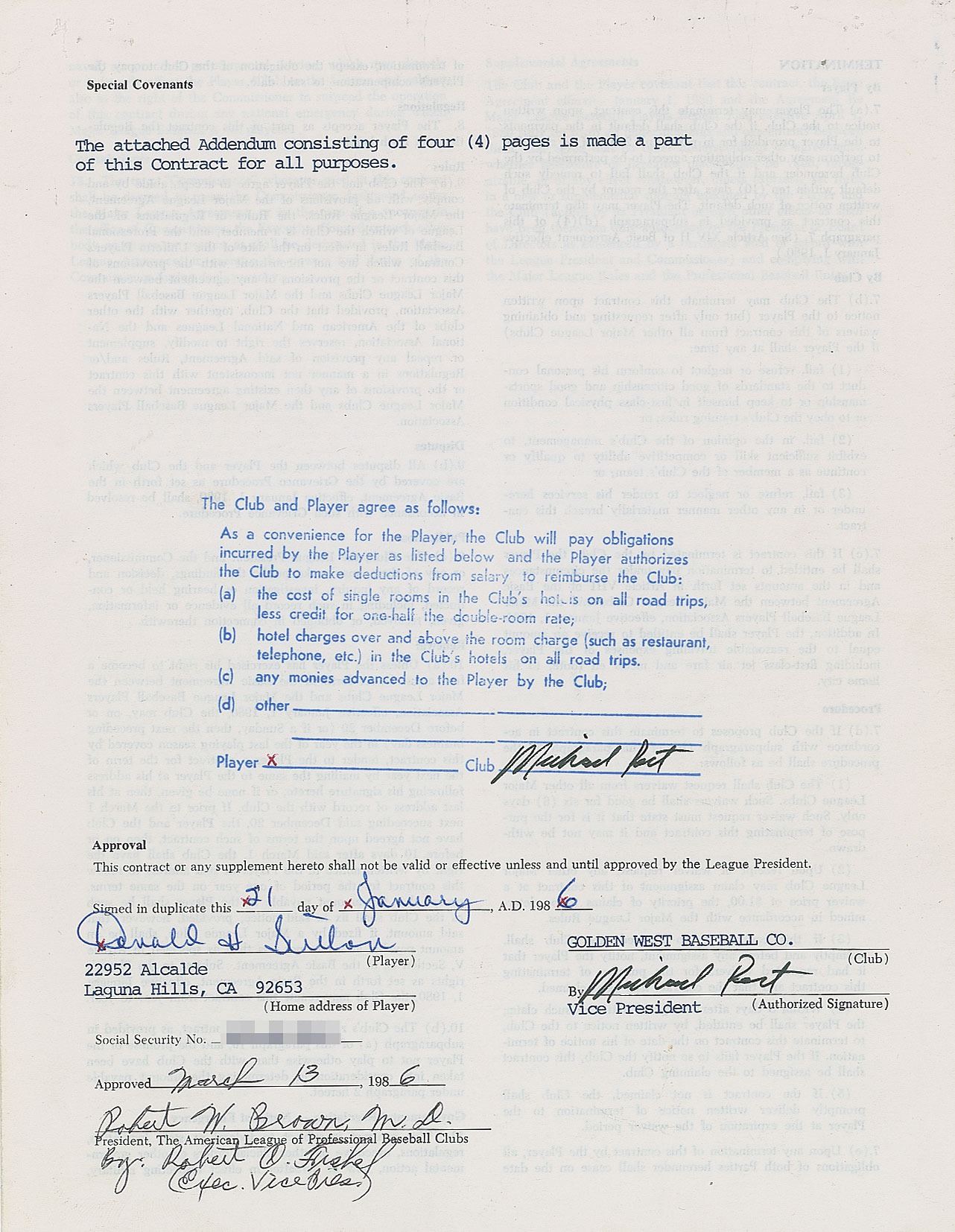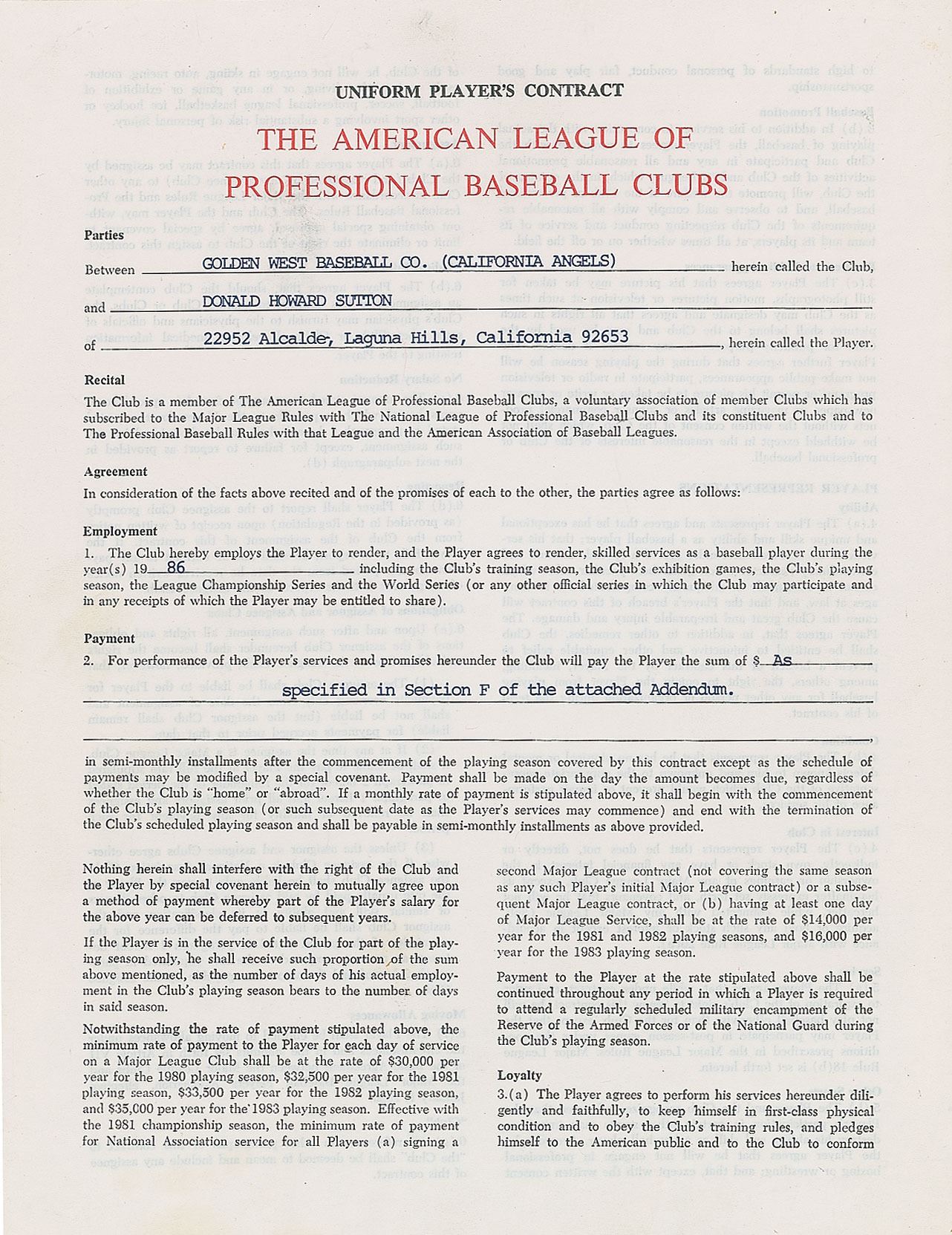 Contract, signed “Donald H. Sutton,” six pages on three adjoining sheets plus a four-page addendum, 8.5 x 11, January 21, 1986. American League uniform player’s contract in which Don Sutton agrees to render "skilled services as a baseball player during the year 1986” for the California Angels, for a salary of $550,000. Signed at the conclusion in blue ballpoint by Sutton and countersigned by Angels General Manager Mike Port and by American League Vice President Robert O. Fishel on behalf of Bobby Brown. Port also signs a special covenant related to hotels and transportation. The addendum outlining Sutton’s salary and guarantee terms has also been signed at the conclusion by Sutton and Port, with the same two also signing an attached amendment relating to accommodation and payment methods. In overall fine condition. In 1986, Sutton joined the esteemed '300 Win Club,' a Hall of Fame–worthy milestone.