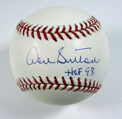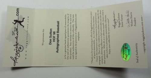 Rawlings Official Major League Baseball signed 'Don Sutton HOF 98' Very nice signature in blue ink. Seal of Authenticity -- Reggie Jackson Authentics. Packaged in a soft felt like cloth drawstring bag inside collectors box. Est. Value $85.00 - $105.00.