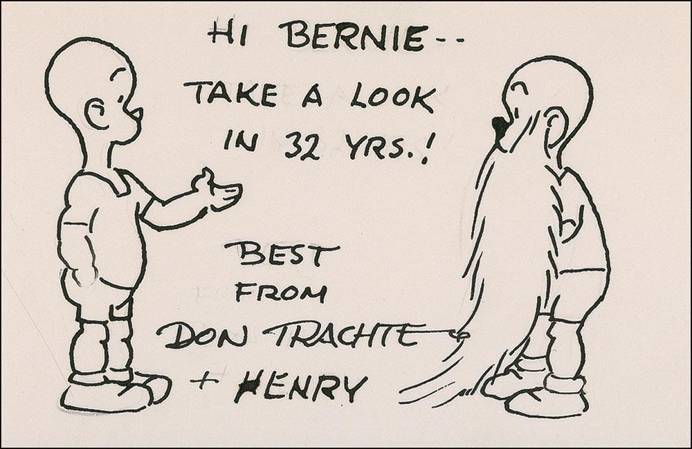 Original vintage signed and inscribed ink sketch of Henry as a boy and a bearded old man on an off-white 5 x 3.25 card, signed and inscribed, “Hi Bernie—Take a look in 32 years! Best from Don Trachte & Henry.” In very fine condition. RRAuction COA.