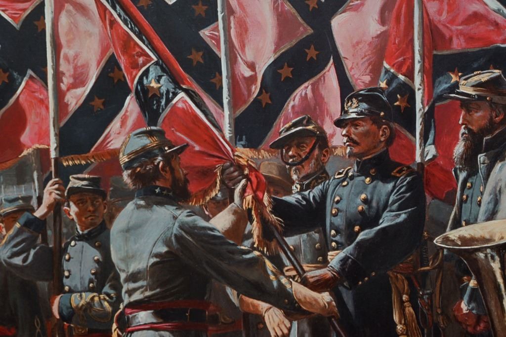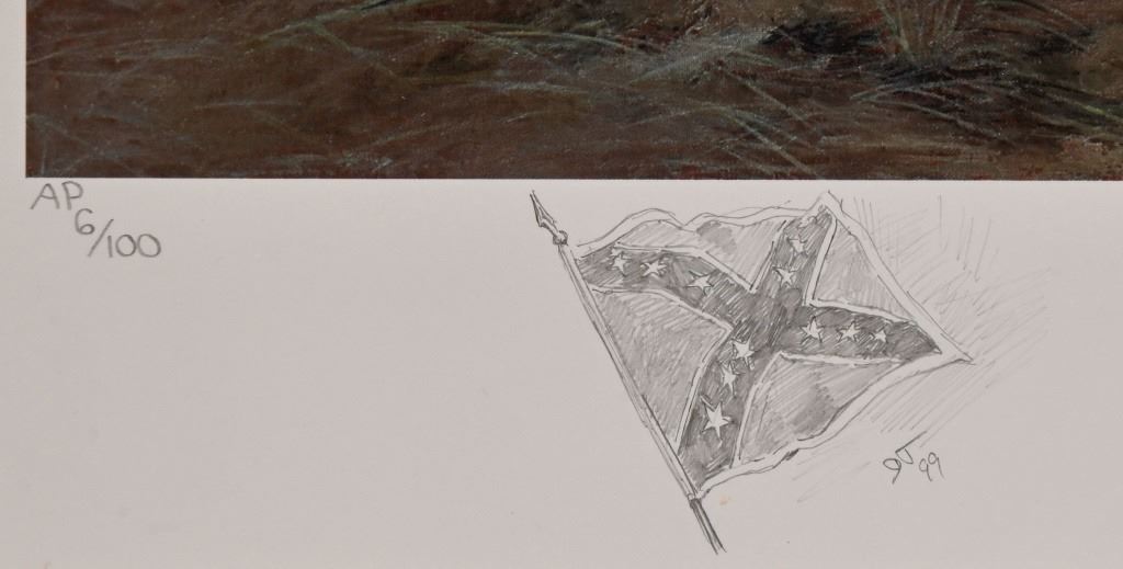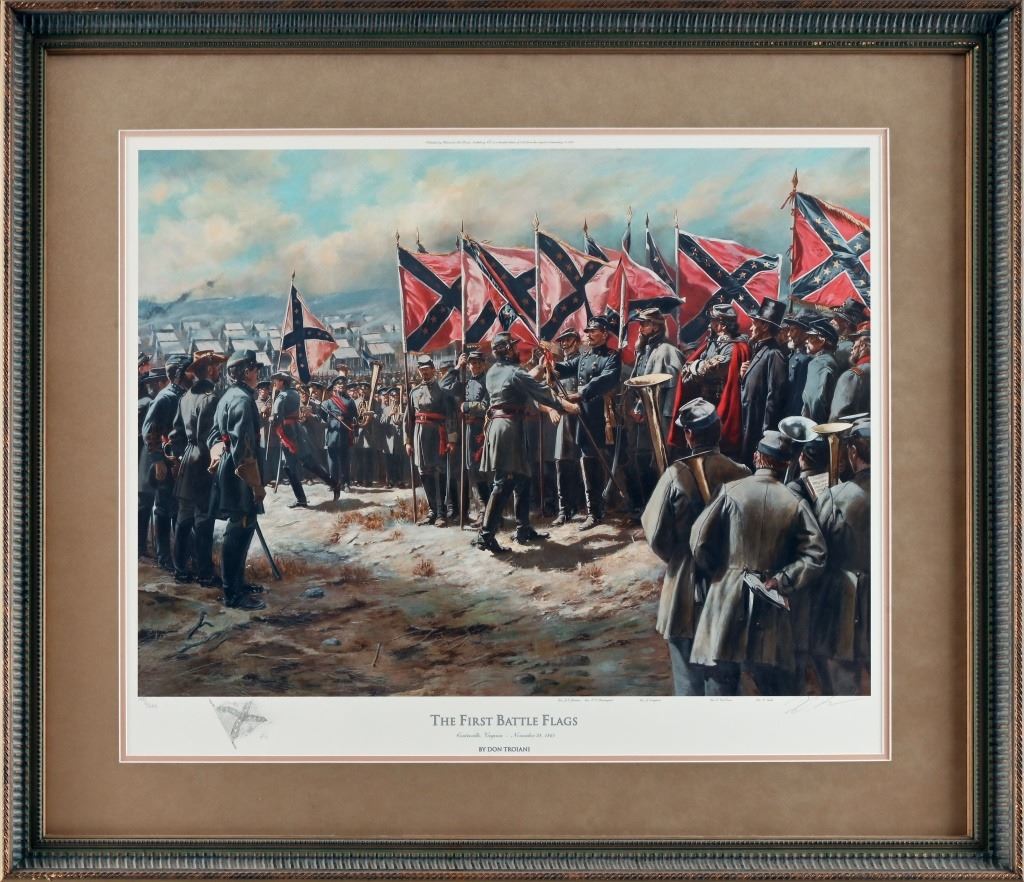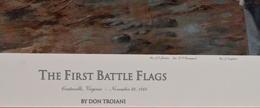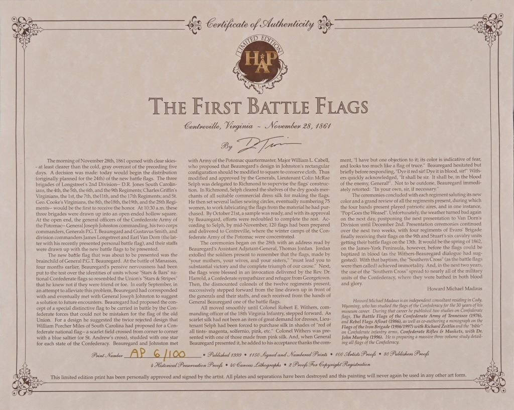 "The First Battle Flags" Centerville, Virginia - November 28, 1861. Print No. AP 6/100. Published 1999. Measures 23" x 28". Frame measures 32 3/4" x 37 1/2". Comes with Certificate of Authenticity.