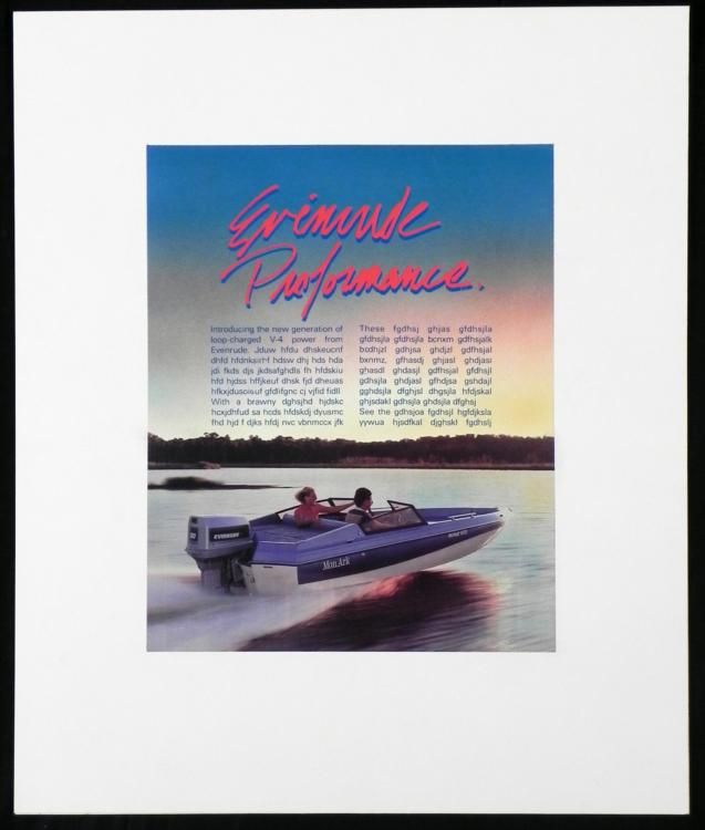 This appears to be the beginning of another one of Don's inventive pitches about a new speed boat called Evenrude Performance... * * Artist: Don WeaverMedium: Print on cardboardSignature: On obverse paper in pencil, lower rightPresentation: Mock-up * * Image Size: 5 3/4" x 8 3/4"Size of Backing: 12 1/2" x 15"Condition: Excellent * * These are some of the original pieces that Don Weaver offered too potential clients, apart of his portfolio. Most of them were done in the earlier years of his life. * * * * * Don Weaver has over 20 years of experience in advertising, marketing, and graphics; he has the experience and ability to communicate your message in a creative, effective, and memorable way. * Most recently, he spent six years as the Advertising Creative Manager (and Graphics Manager) with The Tampa Tribune. Previous positions included creative director and art director for agencies in Phoenix and Memphis, * production manager for a major printing company, and marketing director for an international nutritional supplement company. In addition to creative strategy development and graphic design, he has extensive experience * in broadcast, video, and digital media production. Don originally started out as a photographer, but soon realized that he was even stronger in design and writing. That photographic background still gives Don a unique perspective that translates into his design * style. * * * * *