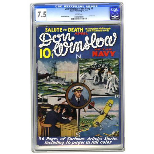 <B>Don Winslow of the Navy #1 (Merwil Publishing, 1937) CGC VF- 7.5 White pages.</B></I> Hold everything! When we heard that a <B>Don Winslow</B></I> #1 was arriving at Heritage HQ, we were expecting a 1940s Fawcett, not a pre-Golden Age book with a painted cover! This is a cross between a comic and a pulp: it's comic size and staple-bound, with 16 pages of color comics, but there's also a full-length text novel starring Don Winslow. The comic part has art by Sheldon Mayer, featuring Captain Colorful and Jupiter Jones (no relation to the teen detective of later years). We feel comfortable calling this a rare item -- we hadn't seen one before today, and a total of two have been certified by CGC to date. Overstreet doesn't list a value above VF, so there's a good chance that this is the best copy out there. Overstreet 2006 VF 8.0 value = $4,800. CGC census 3/06: 1 in 7.5, none higher.