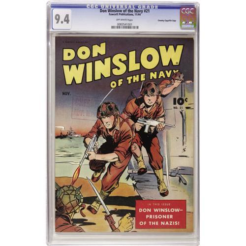 <B>Don Winslow of the Navy #21 Crowley Copy/File Copy (Fawcett, 1944) CGC NM 9.4 Off-white pages.</B></I> Only one other copy on the current CGC census. Overstreet 2006 NM- 9.2 value = $150. CGC census 10/06: 1 in 9.4, none higher.<BR><BR><b>Shipping:</b> Slabbed Comic (<a target="_blank" href="http://www.heritageauctions.com/common/shipping.php">view shipping information</a>)