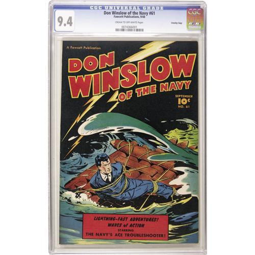 <B>Don Winslow of the Navy #61 Crowley Copy pedigree (Fawcett, 1948) CGC NM 9.4 Cream to off-white pages.</B></I> Extremely colorful "lost at sea" cover, featuring a spotless black background. Overstreet 2006 NM- 9.2 value = $120. CGC census 10/06: 1 in 9.4, 1 higher.<BR><BR><b>Shipping:</b> Slabbed Comic (<a target="_blank" href="http://www.heritageauctions.com/common/shipping.php">view shipping information</a>)