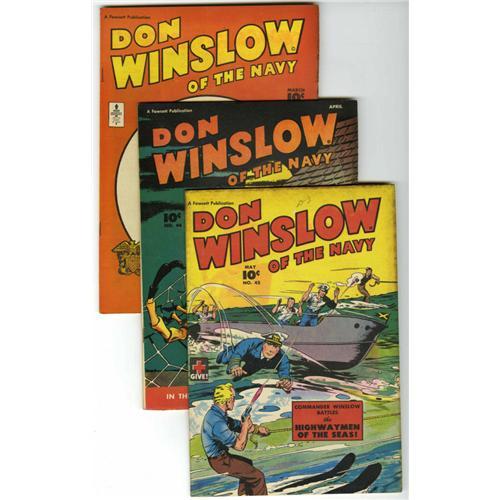 Here's a nice stack of comics featuring Fawcett's Navy (and Coast Guard) hero. Issues include: #40 (VF), #41 (VF-), #42 (VF/NM), #43 (VF+), #44 (VF+), #45 (VF+), #46 (VF/NM), #47 (VF-), #48 (underwater cover - VF+), #51 (Singapore Sal appearance - VF-), #52 (FN/VF), #53 (VF), #54 (VF-), #55 (VF-), #56 (VF), #57 (FN-), #58 (VF-), #59 (VF), #60 (Singapore Sal appearance - FN+), #64 (FN/VF), and #68 (FR). Approximate Overstreet value for group = $1,350. <I>From the Crippen Collection.</B></I><BR><BR><b>Shipping:</b> Books & Catalogs (<a target="_blank" href="http://www.heritageauctions.com/common/shipping.php">view shipping information</a>)