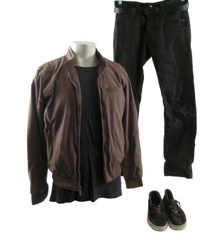 From the number one movie in America Don't Breathe and direct from the production company who produced this amazing horror film is Alex (Dylan Minnette) screen worn, hero, production distressed bloody brown 'Members Only' jacket, (size S) black short sleeve with front pocket 'Levis' t-shirt, black leather belt, black denim 'H&M' jeans, and worn blue canvas lace up the front 'Linix' shoes. (size 45). This complete costume was screen worn in the movie.