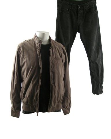 Alex (Dylan Minnette) screen worn, hero, distressed from production, blood at the neck and bloody hole in the back, brown zipper up the front with front pockets 'Members Only' jacket, (size M) black short sleeve with front pocket t-shirt, and black denim 'H&M' jeans. (size 29) Includes wardrobe tag.